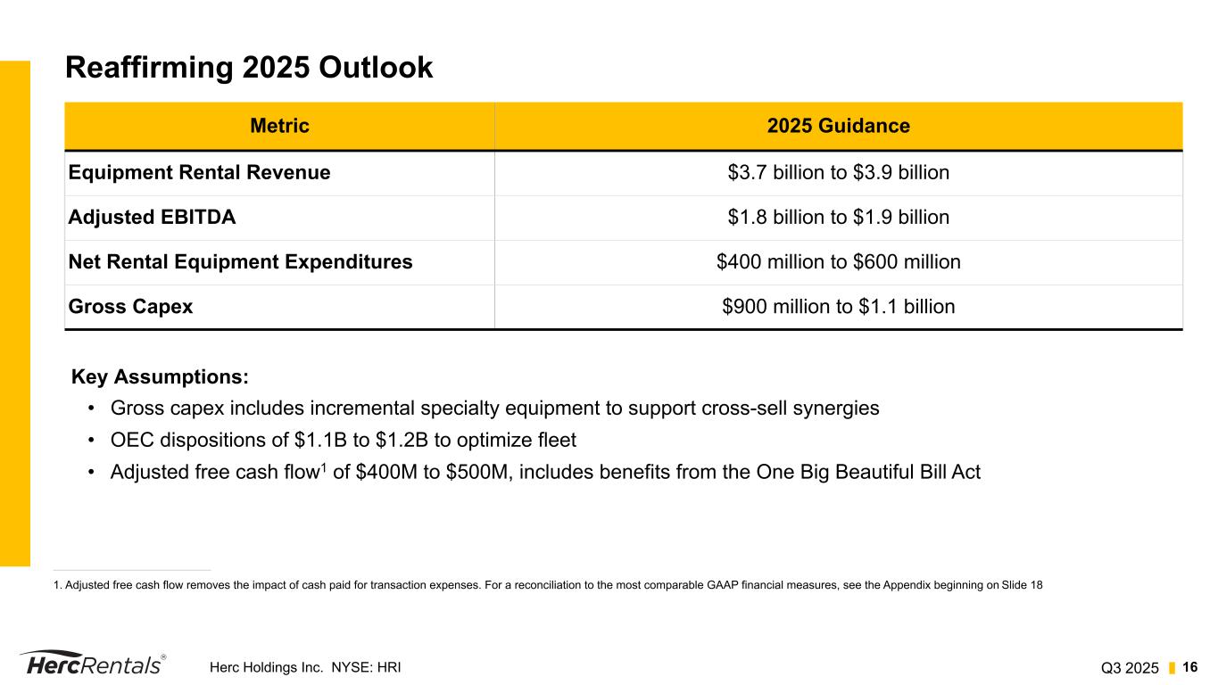 Q3 2025Herc Holdings Inc. NYSE: HRI 15 Disciplined Capital Management 1. The AR Facility is excluded from current maturities of long-term debt as the Company has the intent and ability to consummate refinancing and extend the term of the agreement 2. Total liquidity includes cash and cash equivalents and the unused commitments under the ABL Credit Facility and AR Facility 3. For a definition and calculation, see the Appendix beginning on Slide 18 Maturities As of September 30, 2025 $ in millions $1,200 $800 $1,650 $1,100 $2,258 $750 $400 2026 2027 2028 2029 2030 2031 2032 2033 $81 Finance Leases 2025-2044 2027 Senior Unsecured Notes AR Facility1 2029 Senior Unsecured Notes ABL Credit Facility Ample liquidity2 of $1.8B provides financial flexibility Net leverage3 of 3.8x Adjusted free cash flow3 of $342M for nine months ended 2025 Quarterly dividend of $0.70 per share, paid on September 5, 2025 Maintained Credit Ratings Moody's CFR Ba2; S&P BB 2033 Senior Unsecured Notes 2030 Senior Unsecured Notes Term Loan Facility