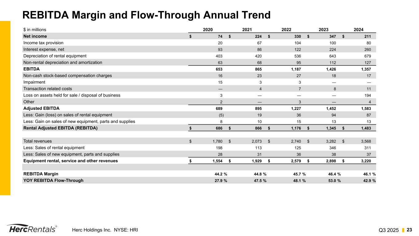 Q3 2025Herc Holdings Inc. NYSE: HRI 23 REBITDA Margin and Flow-Through Annual Trend $ in millions 2020 2021 2022 2023 2024 Net income $ 74 $ 224 $ 330 $ 347 $ 211 Income tax provision 20 67 104 100 80 Interest expense, net 93 86 122 224 260 Depreciation of rental equipment 403 420 536 643 679 Non-rental depreciation and amortization 63 68 95 112 127 EBITDA 653 865 1,187 1,426 1,357 Non-cash stock-based compensation charges 16 23 27 18 17 Impairment 15 3 3 — — Transaction related costs — 4 7 8 11 Loss on assets held for sale / disposal of business 3 — — — 194 Other 2 — 3 — 4 Adjusted EBITDA 689 895 1,227 1,452 1,583 Less: Gain (loss) on sales of rental equipment (5) 19 36 94 87 Less: Gain on sales of new equipment, parts and supplies 8 10 15 13 13 Rental Adjusted EBITDA (REBITDA) $ 686 $ 866 $ 1,176 $ 1,345 $ 1,483 Total revenues $ 1,780 $ 2,073 $ 2,740 $ 3,282 $ 3,568 Less: Sales of rental equipment 198 113 125 346 311 Less: Sales of new equipment, parts and supplies 28 31 36 38 37 Equipment rental, service and other revenues $ 1,554 $ 1,929 $ 2,579 $ 2,898 $ 3,220 REBITDA Margin 44.2 % 44.8 % 45.7 % 46.4 % 46.1 % YOY REBITDA Flow-Through 27.9 % 47.5 % 48.1 % 53.0 % 42.9 %