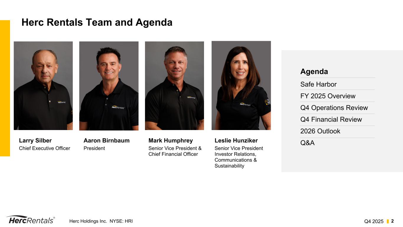 Q4 2025Herc Holdings Inc. NYSE: HRI 2 Herc Rentals Team and Agenda Agenda Safe Harbor FY 2025 Overview Q4 Operations Review Q4 Financial Review 2026 Outlook Q&ALarry Silber Chief Executive Officer Aaron Birnbaum President Mark Humphrey Senior Vice President & Chief Financial Officer Leslie Hunziker Senior Vice President Investor Relations, Communications & Sustainability