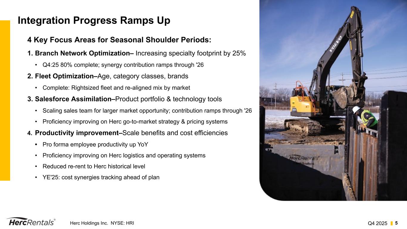Q4 2025Herc Holdings Inc. NYSE: HRI 3 Safe Harbor Statements and Non-GAAP Financial Measures Forward-Looking Statements This presentation includes forward-looking statements within the meaning of Section 21E of the Securities Exchange Act, as amended, and the Private Securities Litigation Reform Act of 1995. Forward looking statements are generally identified by the words "estimates," "expects," "anticipates," "projects," "plans," "intends," "believes," "forecasts," "looks," and future or conditional verbs, such as "will," "should," "could" or "may," as well as variations of such words or similar expressions. All forward-looking statements are based upon our current expectations and various assumptions and there can be no assurance that our current expectations will be achieved. You should not place undue reliance on the forward-looking statements. They are subject to future events, risks and uncertainties - many of which are beyond our control - as well as potentially inaccurate assumptions, that could cause actual results to differ materially from those in the forward-looking statements. Factors that could cause actual results to differ materially from those projected include, but are not limited to, the following: (1) the cyclical nature of our industry and our dependence on the levels of capital investment and maintenance expenditures by our customers; (2) the competitiveness of our industry, including the potential downward pricing pressures or the inability to increase prices; (3) our dependence on relationships with key suppliers; (4) our heavy reliance on communication networks, centralized information technology systems and third party technology and services and our ability to maintain, upgrade or replace our information technology systems; (5) our ability to respond adequately to changes in technology and customer demands; (6) our ability to attract and retain key management, sales and trades talent; (7) our rental fleet is subject to residual value risk upon disposition; (8) the impact of climate change and the legal and regulatory responses to such change; (9) our ability to execute our strategy to grow through strategic transactions;(10) our significant indebtedness; and (11) our ability to integrate the acquisition of H&E Equipment Services, Inc. into our business and our ability to realize all the anticipated benefits of the transaction. Further information on the risks that may affect our business is included in filings we make with the Securities and Exchange Commission from time to time, including our most recent annual report on Form 10-K, subsequent quarterly reports on Form 10-Q, and in our other SEC filings. We undertake no obligation to update or revise forward- looking statements that have been made to reflect events or circumstances that arise after the date made or to reflect the occurrence of unanticipated events. Information Regarding Non-GAAP Financial Measures In addition to results calculated according to accounting principles generally accepted in the United States (“GAAP”), the Company has provided certain information in this presentation that is not calculated according to GAAP (“non-GAAP”), such as adjusted net income, adjusted earnings per diluted share, EBITDA, adjusted EBITDA, adjusted EBITDA margin, REBITDA, REBITDA margin, REBITDA flow-through, free cash flow and adjusted free cash flow. Management uses these non-GAAP measures to evaluate operating performance and period-over-period performance of our core business without regard to potential distortions, and believes that investors will likewise find these non-GAAP measures useful in evaluating the Company’s performance. These measures are frequently used by security analysts, institutional investors and other interested parties in the evaluation of companies in our industry. Non-GAAP measures should not be considered in isolation or as a substitute for our reported results prepared in accordance with GAAP and, as calculated, may not be comparable to similarly titled measures of other companies. For the definitions of these terms, further information about management’s use of these measures as well as a reconciliation of these non-GAAP measures to the most comparable GAAP financial measures, please see the appendix that accompanies this presentation.