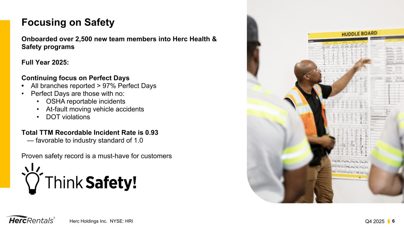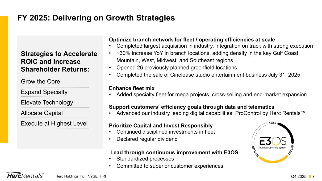 Q4 2025Herc Holdings Inc. NYSE: HRI 6 Focusing on Safety Onboarded over 2,500 new team members into Herc Health & Safety programs Full Year 2025: Continuing focus on Perfect Days • All branches reported > 97% Perfect Days • Perfect Days are those with no: • OSHA reportable incidents • At-fault moving vehicle accidents • DOT violations Total TTM Recordable Incident Rate is 0.93 — favorable to industry standard of 1.0 Proven safety record is a must-have for customers