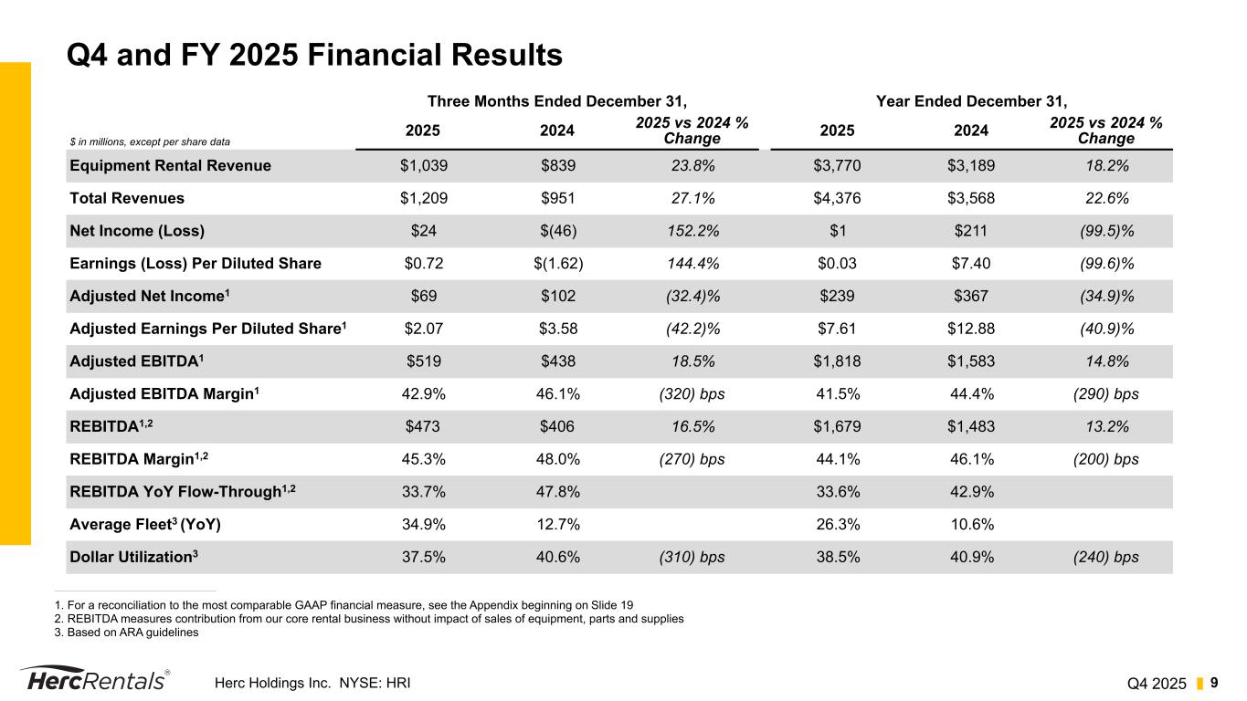 Q4 2025Herc Holdings Inc. NYSE: HRI 3 Safe Harbor Statements and Non-GAAP Financial Measures Forward-Looking Statements This presentation includes forward-looking statements within the meaning of Section 21E of the Securities Exchange Act, as amended, and the Private Securities Litigation Reform Act of 1995. Forward looking statements are generally identified by the words "estimates," "expects," "anticipates," "projects," "plans," "intends," "believes," "forecasts," "looks," and future or conditional verbs, such as "will," "should," "could" or "may," as well as variations of such words or similar expressions. All forward-looking statements are based upon our current expectations and various assumptions and there can be no assurance that our current expectations will be achieved. You should not place undue reliance on the forward-looking statements. They are subject to future events, risks and uncertainties - many of which are beyond our control - as well as potentially inaccurate assumptions, that could cause actual results to differ materially from those in the forward-looking statements. Factors that could cause actual results to differ materially from those projected include, but are not limited to, the following: (1) the cyclical nature of our industry and our dependence on the levels of capital investment and maintenance expenditures by our customers; (2) the competitiveness of our industry, including the potential downward pricing pressures or the inability to increase prices; (3) our dependence on relationships with key suppliers; (4) our heavy reliance on communication networks, centralized information technology systems and third party technology and services and our ability to maintain, upgrade or replace our information technology systems; (5) our ability to respond adequately to changes in technology and customer demands; (6) our ability to attract and retain key management, sales and trades talent; (7) our rental fleet is subject to residual value risk upon disposition; (8) the impact of climate change and the legal and regulatory responses to such change; (9) our ability to execute our strategy to grow through strategic transactions;(10) our significant indebtedness; and (11) our ability to integrate the acquisition of H&E Equipment Services, Inc. into our business and our ability to realize all the anticipated benefits of the transaction. Further information on the risks that may affect our business is included in filings we make with the Securities and Exchange Commission from time to time, including our most recent annual report on Form 10-K, subsequent quarterly reports on Form 10-Q, and in our other SEC filings. We undertake no obligation to update or revise forward- looking statements that have been made to reflect events or circumstances that arise after the date made or to reflect the occurrence of unanticipated events. Information Regarding Non-GAAP Financial Measures In addition to results calculated according to accounting principles generally accepted in the United States (“GAAP”), the Company has provided certain information in this presentation that is not calculated according to GAAP (“non-GAAP”), such as adjusted net income, adjusted earnings per diluted share, EBITDA, adjusted EBITDA, adjusted EBITDA margin, REBITDA, REBITDA margin, REBITDA flow-through, free cash flow and adjusted free cash flow. Management uses these non-GAAP measures to evaluate operating performance and period-over-period performance of our core business without regard to potential distortions, and believes that investors will likewise find these non-GAAP measures useful in evaluating the Company’s performance. These measures are frequently used by security analysts, institutional investors and other interested parties in the evaluation of companies in our industry. Non-GAAP measures should not be considered in isolation or as a substitute for our reported results prepared in accordance with GAAP and, as calculated, may not be comparable to similarly titled measures of other companies. For the definitions of these terms, further information about management’s use of these measures as well as a reconciliation of these non-GAAP measures to the most comparable GAAP financial measures, please see the appendix that accompanies this presentation.