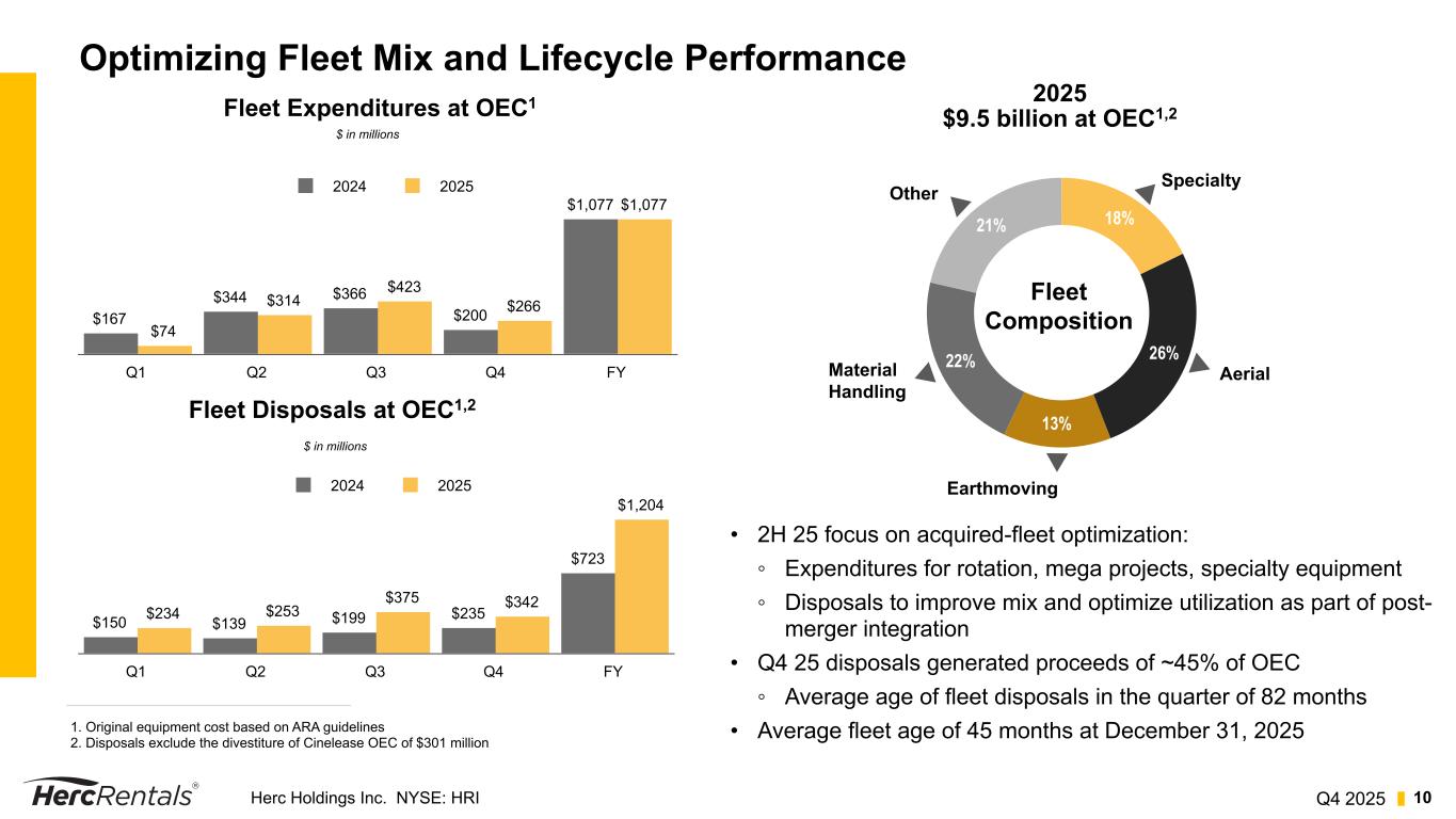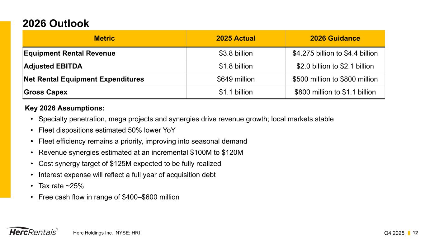 Q4 2025Herc Holdings Inc. NYSE: HRI 12 2026 Outlook Key 2026 Assumptions: • Specialty penetration, mega projects and synergies drive revenue growth; local markets stable • Fleet dispositions estimated 50% lower YoY • Fleet efficiency remains a priority, improving into seasonal demand • Revenue synergies estimated at an incremental $100M to $120M • Cost synergy target of $125M expected to be fully realized • Interest expense will reflect a full year of acquisition debt • Tax rate ~25% • Free cash flow in range of $400–$600 million Metric 2025 Actual 2026 Guidance Equipment Rental Revenue $3.8 billion $4.275 billion to $4.4 billion Adjusted EBITDA $1.8 billion $2.0 billion to $2.1 billion Net Rental Equipment Expenditures $649 million $500 million to $800 million Gross Capex $1.1 billion $800 million to $1.1 billion