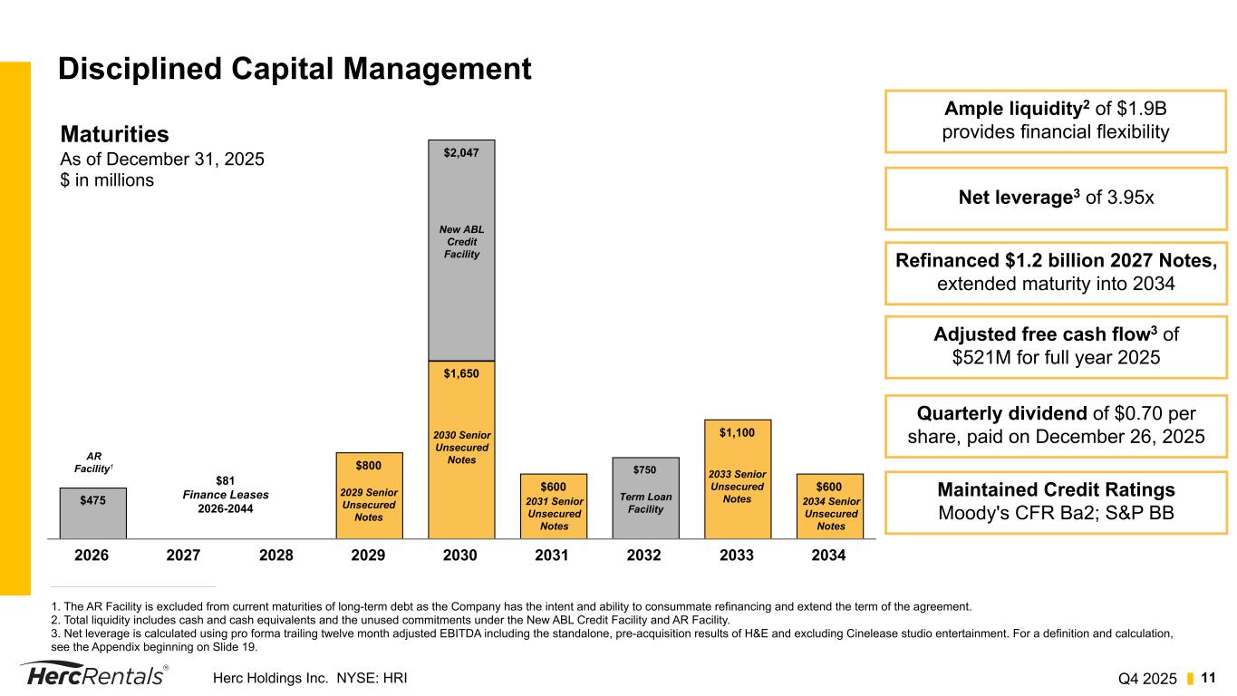 Q4 2025Herc Holdings Inc. NYSE: HRI 11 Disciplined Capital Management 1. The AR Facility is excluded from current maturities of long-term debt as the Company has the intent and ability to consummate refinancing and extend the term of the agreement. 2. Total liquidity includes cash and cash equivalents and the unused commitments under the New ABL Credit Facility and AR Facility. 3. Net leverage is calculated using pro forma trailing twelve month adjusted EBITDA including the standalone, pre-acquisition results of H&E and excluding Cinelease studio entertainment. For a definition and calculation, see the Appendix beginning on Slide 19. Maturities As of December 31, 2025 $ in millions $800 $1,650 $600 $1,100 $600 $2,047 $750 $475 2026 2027 2028 2029 2030 2031 2032 2033 2034 $81 Finance Leases 2026-2044 2031 Senior Unsecured Notes AR Facility1 2029 Senior Unsecured Notes New ABL Credit Facility Ample liquidity2 of $1.9B provides financial flexibility Net leverage3 of 3.95x Adjusted free cash flow3 of $521M for full year 2025 Quarterly dividend of $0.70 per share, paid on December 26, 2025 Maintained Credit Ratings Moody's CFR Ba2; S&P BB 2033 Senior Unsecured Notes 2030 Senior Unsecured Notes Term Loan Facility 2034 Senior Unsecured Notes Refinanced $1.2 billion 2027 Notes, extended maturity into 2034