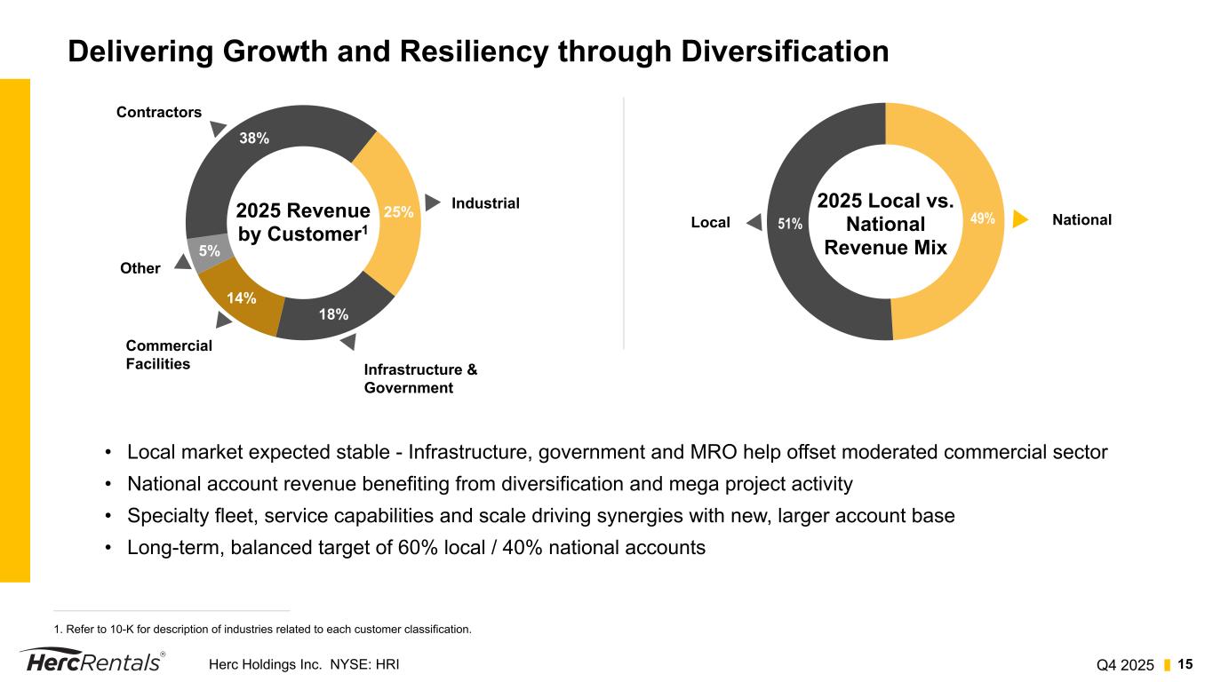 Q4 2025Herc Holdings Inc. NYSE: HRI 14 Operational Progress in 1H:26 Unlocks 2H:26 Growth Momentum Integration • Expanded regional management & organizational design • Sales territory optimization • Technology integration • Branch network optimization • Fleet & supply chain optimization • Salesforce assimilation for systems & go-to-market strategy • Branch assimilation for systems & Herc operating model • Productivity improvements • Cultural alignment New Foundation • 30% larger business by fleet, people, locations • Fleet optimization, the base for: ◦ improving utilization into seasonal peak ◦ driving revenue growth ◦ expanding synergies Acceleration • 2026 growth-fleet onboarding • New specialty locations gaining momentum • Larger sales force maturing • Efficiencies of scale increasing 2H:25 1H:26 2H:26