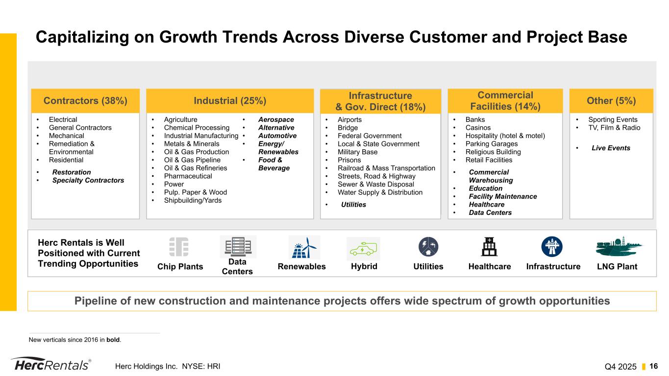 Q4 2025Herc Holdings Inc. NYSE: HRI 15 Delivering Growth and Resiliency through Diversification 2025 Local vs. National Revenue Mix 49%51% National2025 Revenue by Customer1 38% 25% 18% 14% 5% Local Commercial Facilities Contractors Infrastructure & Government Other Industrial • Local market expected stable - Infrastructure, government and MRO help offset moderated commercial sector • National account revenue benefiting from diversification and mega project activity • Specialty fleet, service capabilities and scale driving synergies with new, larger account base • Long-term, balanced target of 60% local / 40% national accounts 1. Refer to 10-K for description of industries related to each customer classification.