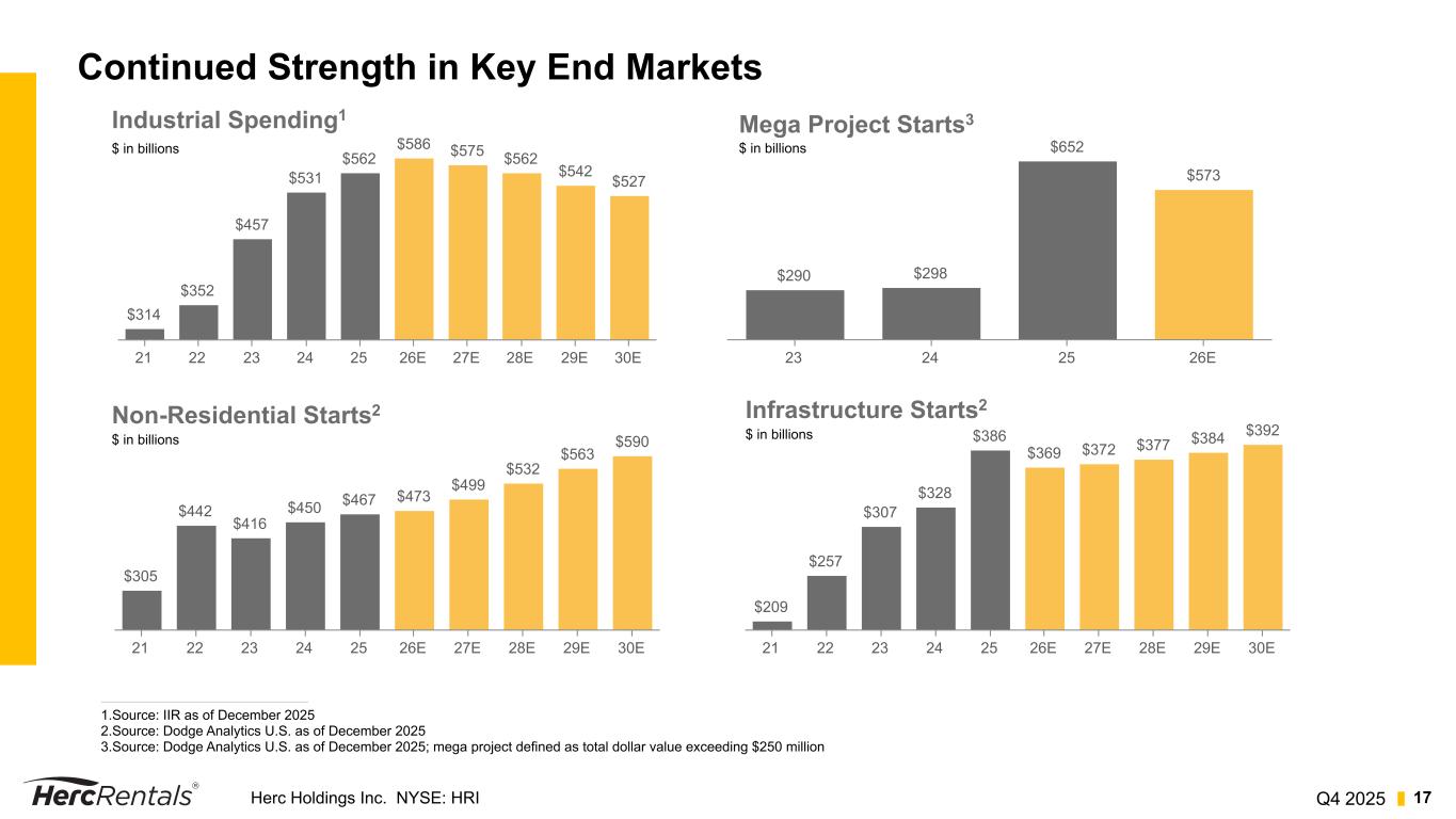 Q4 2025Herc Holdings Inc. NYSE: HRI 16 Capitalizing on Growth Trends Across Diverse Customer and Project Base Pipeline of new construction and maintenance projects offers wide spectrum of growth opportunities • Banks • Casinos • Hospitality (hotel & motel) • Parking Garages • Religious Building • Retail Facilities • Commercial Warehousing • Education • Facility Maintenance • Healthcare • Data Centers • Sporting Events • TV, Film & Radio • Live Events Contractors (38%) Industrial (25%) Commercial Facilities (14%) Other (5%) • Aerospace • Alternative • Automotive • Energy/ Renewables • Food & Beverage • Agriculture • Chemical Processing • Industrial Manufacturing • Metals & Minerals • Oil & Gas Production • Oil & Gas Pipeline • Oil & Gas Refineries • Pharmaceutical • Power • Pulp. Paper & Wood • Shipbuilding/Yards • Electrical • General Contractors • Mechanical • Remediation & Environmental • Residential • Restoration • Specialty Contractors • Airports • Bridge • Federal Government • Local & State Government • Military Base • Prisons • Railroad & Mass Transportation • Streets, Road & Highway • Sewer & Waste Disposal • Water Supply & Distribution • Utilities Infrastructure & Gov. Direct (18%) Herc Rentals is Well Positioned with Current Trending Opportunities HybridChip Plants Data Centers LNG PlantRenewables Utilities Healthcare Infrastructure New verticals since 2016 in bold.