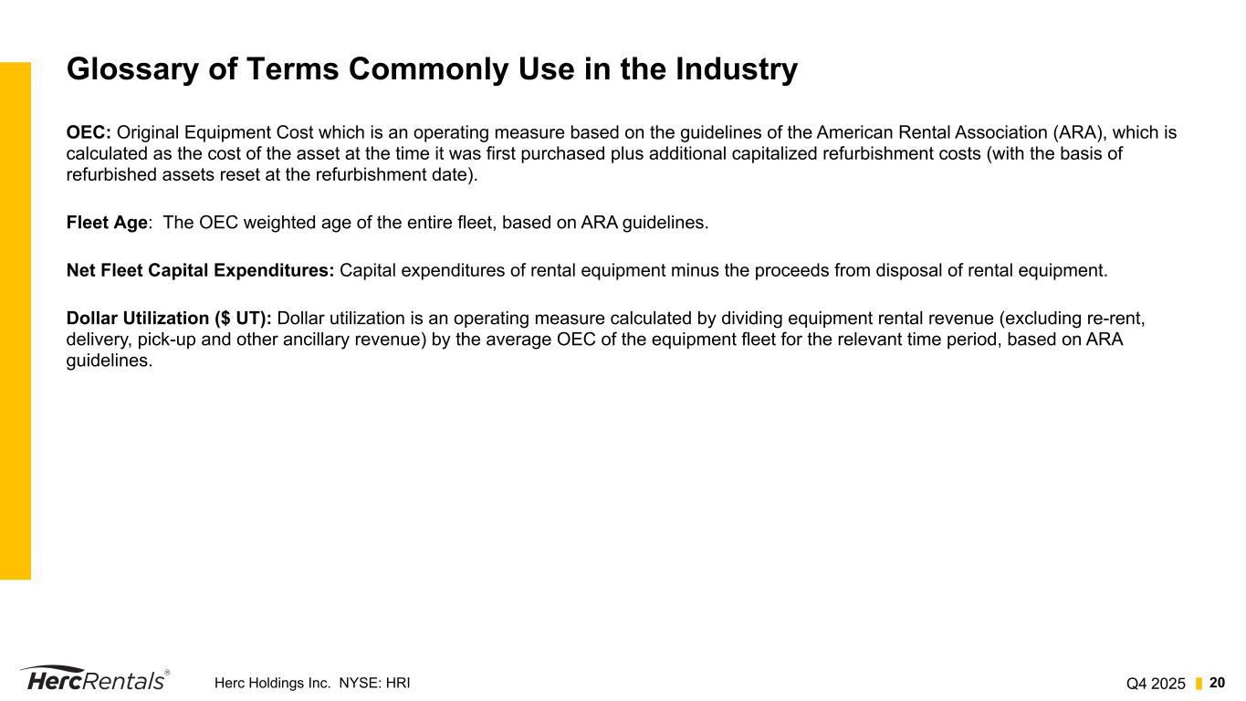 Q4 2025Herc Holdings Inc. NYSE: HRI 20 Glossary of Terms Commonly Use in the Industry OEC: Original Equipment Cost which is an operating measure based on the guidelines of the American Rental Association (ARA), which is calculated as the cost of the asset at the time it was first purchased plus additional capitalized refurbishment costs (with the basis of refurbished assets reset at the refurbishment date). Fleet Age: The OEC weighted age of the entire fleet, based on ARA guidelines. Net Fleet Capital Expenditures: Capital expenditures of rental equipment minus the proceeds from disposal of rental equipment. Dollar Utilization ($ UT): Dollar utilization is an operating measure calculated by dividing equipment rental revenue (excluding re-rent, delivery, pick-up and other ancillary revenue) by the average OEC of the equipment fleet for the relevant time period, based on ARA guidelines.