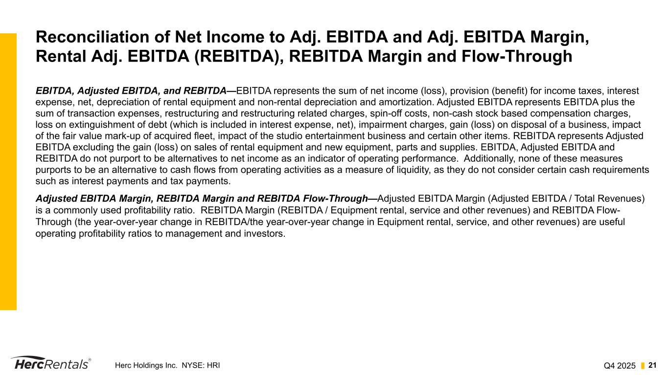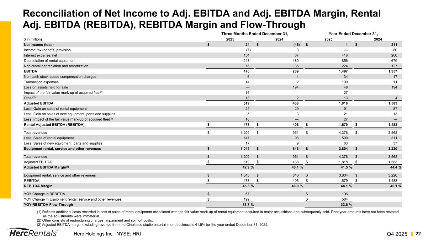 Q4 2025Herc Holdings Inc. NYSE: HRI 21 Reconciliation of Net Income to Adj. EBITDA and Adj. EBITDA Margin, Rental Adj. EBITDA (REBITDA), REBITDA Margin and Flow-Through EBITDA, Adjusted EBITDA, and REBITDA—EBITDA represents the sum of net income (loss), provision (benefit) for income taxes, interest expense, net, depreciation of rental equipment and non-rental depreciation and amortization. Adjusted EBITDA represents EBITDA plus the sum of transaction expenses, restructuring and restructuring related charges, spin-off costs, non-cash stock based compensation charges, loss on extinguishment of debt (which is included in interest expense, net), impairment charges, gain (loss) on disposal of a business, impact of the fair value mark-up of acquired fleet, impact of the studio entertainment business and certain other items. REBITDA represents Adjusted EBITDA excluding the gain (loss) on sales of rental equipment and new equipment, parts and supplies. EBITDA, Adjusted EBITDA and REBITDA do not purport to be alternatives to net income as an indicator of operating performance. Additionally, none of these measures purports to be an alternative to cash flows from operating activities as a measure of liquidity, as they do not consider certain cash requirements such as interest payments and tax payments. Adjusted EBITDA Margin, REBITDA Margin and REBITDA Flow-Through—Adjusted EBITDA Margin (Adjusted EBITDA / Total Revenues) is a commonly used profitability ratio. REBITDA Margin (REBITDA / Equipment rental, service and other revenues) and REBITDA Flow- Through (the year-over-year change in REBITDA/the year-over-year change in Equipment rental, service, and other revenues) are useful operating profitability ratios to management and investors.