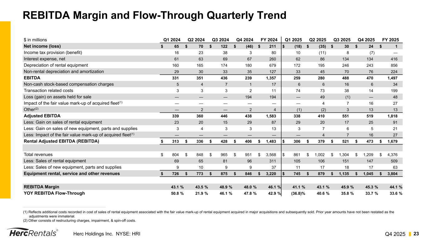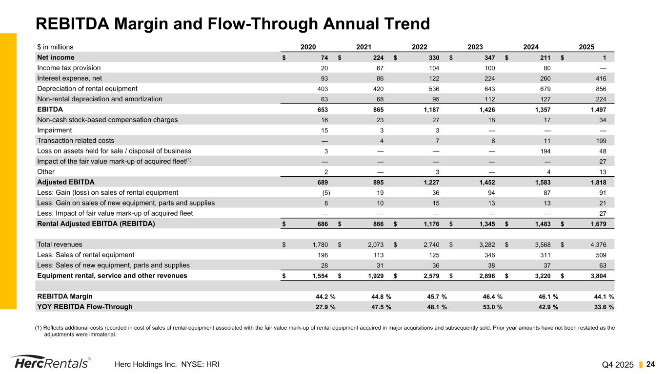 Q4 2025Herc Holdings Inc. NYSE: HRI 23 REBITDA Margin and Flow-Through Quarterly Trend $ in millions Q1 2024 Q2 2024 Q3 2024 Q4 2024 FY 2024 Q1 2025 Q2 2025 Q3 2025 Q4 2025 FY 2025 Net income (loss) $ 65 $ 70 $ 122 $ (46) $ 211 $ (18) $ (35) $ 30 $ 24 $ 1 Income tax provision (benefit) 16 23 38 3 80 10 (11) 8 (7) — Interest expense, net 61 63 69 67 260 62 86 134 134 416 Depreciation of rental equipment 160 165 174 180 679 172 195 246 243 856 Non-rental depreciation and amortization 29 30 33 35 127 33 45 70 76 224 EBITDA 331 351 436 239 1,357 259 280 488 470 1,497 Non-cash stock-based compensation charges 5 4 7 1 17 6 6 16 6 34 Transaction related costs 3 3 3 2 11 74 73 38 14 199 Loss (gain) on assets held for sale — — — 194 194 — 49 (1) — 48 Impact of the fair value mark-up of acquired fleet(1) — — — — — — 4 7 16 27 Other(2) — 2 — 2 4 (1) (2) 3 13 13 Adjusted EBITDA 339 360 446 438 1,583 338 410 551 519 1,818 Less: Gain on sales of rental equipment 23 20 15 29 87 29 20 17 25 91 Less: Gain on sales of new equipment, parts and supplies 3 4 3 3 13 3 7 6 5 21 Less: Impact of the fair value mark-up of acquired fleet(1) — — — — — — 4 7 16 27 Rental Adjusted EBITDA (REBITDA) $ 313 $ 336 $ 428 $ 406 $ 1,483 $ 306 $ 379 $ 521 $ 473 $ 1,679 Total revenues $ 804 $ 848 $ 965 $ 951 $ 3,568 $ 861 $ 1,002 $ 1,304 $ 1,209 $ 4,376 Less: Sales of rental equipment 69 65 81 96 311 105 106 151 147 509 Less: Sales of new equipment, parts and supplies 9 10 9 9 37 11 17 18 17 63 Equipment rental, service and other revenues $ 726 $ 773 $ 875 $ 846 $ 3,220 $ 745 $ 879 $ 1,135 $ 1,045 $ 3,804 REBITDA Margin 43.1 % 43.5 % 48.9 % 48.0 % 46.1 % 41.1 % 43.1 % 45.9 % 45.3 % 44.1 % YOY REBITDA Flow-Through 50.8 % 21.9 % 46.1 % 47.8 % 42.9 % (36.8) % 40.6 % 35.8 % 33.7 % 33.6 % (1) Reflects additional costs recorded in cost of sales of rental equipment associated with the fair value mark-up of rental equipment acquired in major acquisitions and subsequently sold. Prior year amounts have not been restated as the adjustments were immaterial. (2) Other consists of restructuring charges, impairment, & spin-off costs.