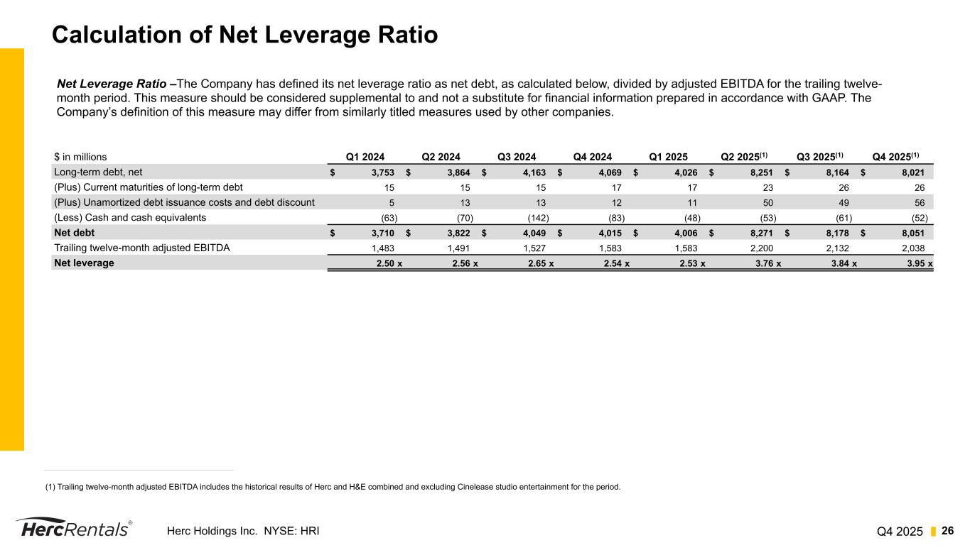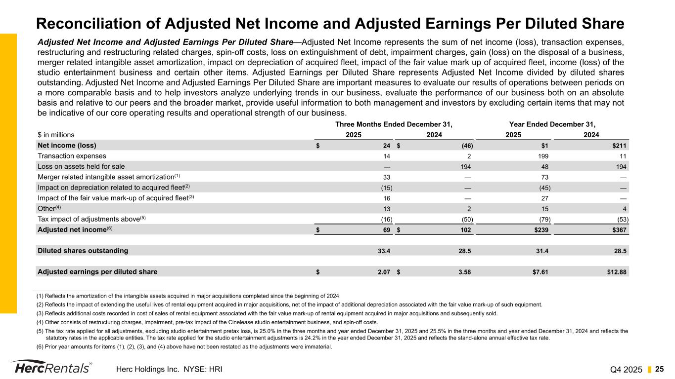Q4 2025Herc Holdings Inc. NYSE: HRI 25 Reconciliation of Adjusted Net Income and Adjusted Earnings Per Diluted Share Three Months Ended December 31, Year Ended December 31, $ in millions 2025 2024 2025 2024 Net income (loss) $ 24 $ (46) $1 $211 Transaction expenses 14 2 199 11 Loss on assets held for sale — 194 48 194 Merger related intangible asset amortization(1) 33 — 73 — Impact on depreciation related to acquired fleet(2) (15) — (45) — Impact of the fair value mark-up of acquired fleet(3) 16 — 27 — Other(4) 13 2 15 4 Tax impact of adjustments above(5) (16) (50) (79) (53) Adjusted net income(6) $ 69 $ 102 $239 $367 Diluted shares outstanding 33.4 28.5 31.4 28.5 Adjusted earnings per diluted share $ 2.07 $ 3.58 $7.61 $12.88 Adjusted Net Income and Adjusted Earnings Per Diluted Share—Adjusted Net Income represents the sum of net income (loss), transaction expenses, restructuring and restructuring related charges, spin-off costs, loss on extinguishment of debt, impairment charges, gain (loss) on the disposal of a business, merger related intangible asset amortization, impact on depreciation of acquired fleet, impact of the fair value mark up of acquired fleet, income (loss) of the studio entertainment business and certain other items. Adjusted Earnings per Diluted Share represents Adjusted Net Income divided by diluted shares outstanding. Adjusted Net Income and Adjusted Earnings Per Diluted Share are important measures to evaluate our results of operations between periods on a more comparable basis and to help investors analyze underlying trends in our business, evaluate the performance of our business both on an absolute basis and relative to our peers and the broader market, provide useful information to both management and investors by excluding certain items that may not be indicative of our core operating results and operational strength of our business. (1) Reflects the amortization of the intangible assets acquired in major acquisitions completed since the beginning of 2024. (2) Reflects the impact of extending the useful lives of rental equipment acquired in major acquisitions, net of the impact of additional depreciation associated with the fair value mark-up of such equipment. (3) Reflects additional costs recorded in cost of sales of rental equipment associated with the fair value mark-up of rental equipment acquired in major acquisitions and subsequently sold. (4) Other consists of restructuring charges, impairment, pre-tax impact of the Cinelease studio entertainment business, and spin-off costs. (5) The tax rate applied for all adjustments, excluding studio entertainment pretax loss, is 25.0% in the three months and year ended December 31, 2025 and 25.5% in the three months and year ended December 31, 2024 and reflects the statutory rates in the applicable entities. The tax rate applied for the studio entertainment adjustments is 24.2% in the year ended December 31, 2025 and reflects the stand-alone annual effective tax rate. (6) Prior year amounts for items (1), (2), (3), and (4) above have not been restated as the adjustments were immaterial.