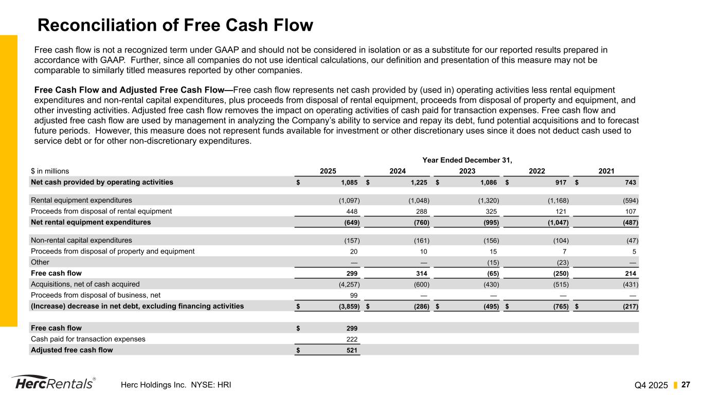 Q4 2025Herc Holdings Inc. NYSE: HRI 27 Reconciliation of Free Cash Flow Year Ended December 31, $ in millions 2025 2024 2023 2022 2021 Net cash provided by operating activities $ 1,085 $ 1,225 $ 1,086 $ 917 $ 743 Rental equipment expenditures (1,097) (1,048) (1,320) (1,168) (594) Proceeds from disposal of rental equipment 448 288 325 121 107 Net rental equipment expenditures (649) (760) (995) (1,047) (487) Non-rental capital expenditures (157) (161) (156) (104) (47) Proceeds from disposal of property and equipment 20 10 15 7 5 Other — — (15) (23) — Free cash flow 299 314 (65) (250) 214 Acquisitions, net of cash acquired (4,257) (600) (430) (515) (431) Proceeds from disposal of business, net 99 — — — — (Increase) decrease in net debt, excluding financing activities $ (3,859) $ (286) $ (495) $ (765) $ (217) Free cash flow $ 299 Cash paid for transaction expenses 222 Adjusted free cash flow $ 521 Free cash flow is not a recognized term under GAAP and should not be considered in isolation or as a substitute for our reported results prepared in accordance with GAAP. Further, since all companies do not use identical calculations, our definition and presentation of this measure may not be comparable to similarly titled measures reported by other companies. Free Cash Flow and Adjusted Free Cash Flow—Free cash flow represents net cash provided by (used in) operating activities less rental equipment expenditures and non-rental capital expenditures, plus proceeds from disposal of rental equipment, proceeds from disposal of property and equipment, and other investing activities. Adjusted free cash flow removes the impact on operating activities of cash paid for transaction expenses. Free cash flow and adjusted free cash flow are used by management in analyzing the Company’s ability to service and repay its debt, fund potential acquisitions and to forecast future periods. However, this measure does not represent funds available for investment or other discretionary uses since it does not deduct cash used to service debt or for other non-discretionary expenditures.