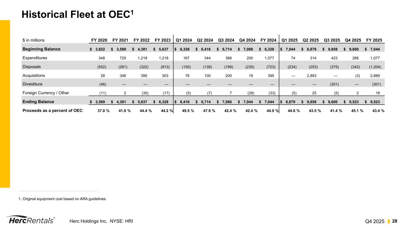 Q4 2025Herc Holdings Inc. NYSE: HRI 28 Historical Fleet at OEC1 $ in millions FY 2020 FY 2021 FY 2022 FY 2023 Q1 2024 Q2 2024 Q3 2024 Q4 2024 FY 2024 Q1 2025 Q2 2025 Q3 2025 Q4 2025 FY 2025 Beginning Balance $ 3,822 $ 3,589 $ 4,381 $ 5,637 $ 6,328 $ 6,416 $ 6,714 $ 7,088 $ 6,328 $ 7,044 $ 6,879 $ 9,858 $ 9,600 $ 7,044 Expenditures 348 725 1,218 1,218 167 344 366 200 1,077 74 314 423 266 1,077 Disposals (552) (281) (322) (813) (150) (139) (199) (235) (723) (234) (253) (375) (342) (1,204) Acquisitions 28 346 395 303 76 100 200 19 395 — 2,893 — (3) 2,889 Divestiture (46) — — — — — — — — — — (301) — (301) Foreign Currency / Other (11) 2 (35) (17) (5) (7) 7 (28) (33) (5) 25 (5) 2 18 Ending Balance $ 3,589 $ 4,381 $ 5,637 $ 6,328 $ 6,416 $ 6,714 $ 7,088 $ 7,044 $ 7,044 $ 6,879 $ 9,858 $ 9,600 $ 9,523 $ 9,523 Proceeds as a percent of OEC 37.0 % 41.8 % 44.4 % 44.2 % 49.5 % 47.9 % 42.4 % 42.4 % 44.9 % 44.8 % 43.5 % 41.4 % 45.1 % 43.4 % 1. Original equipment cost based on ARA guidelines.