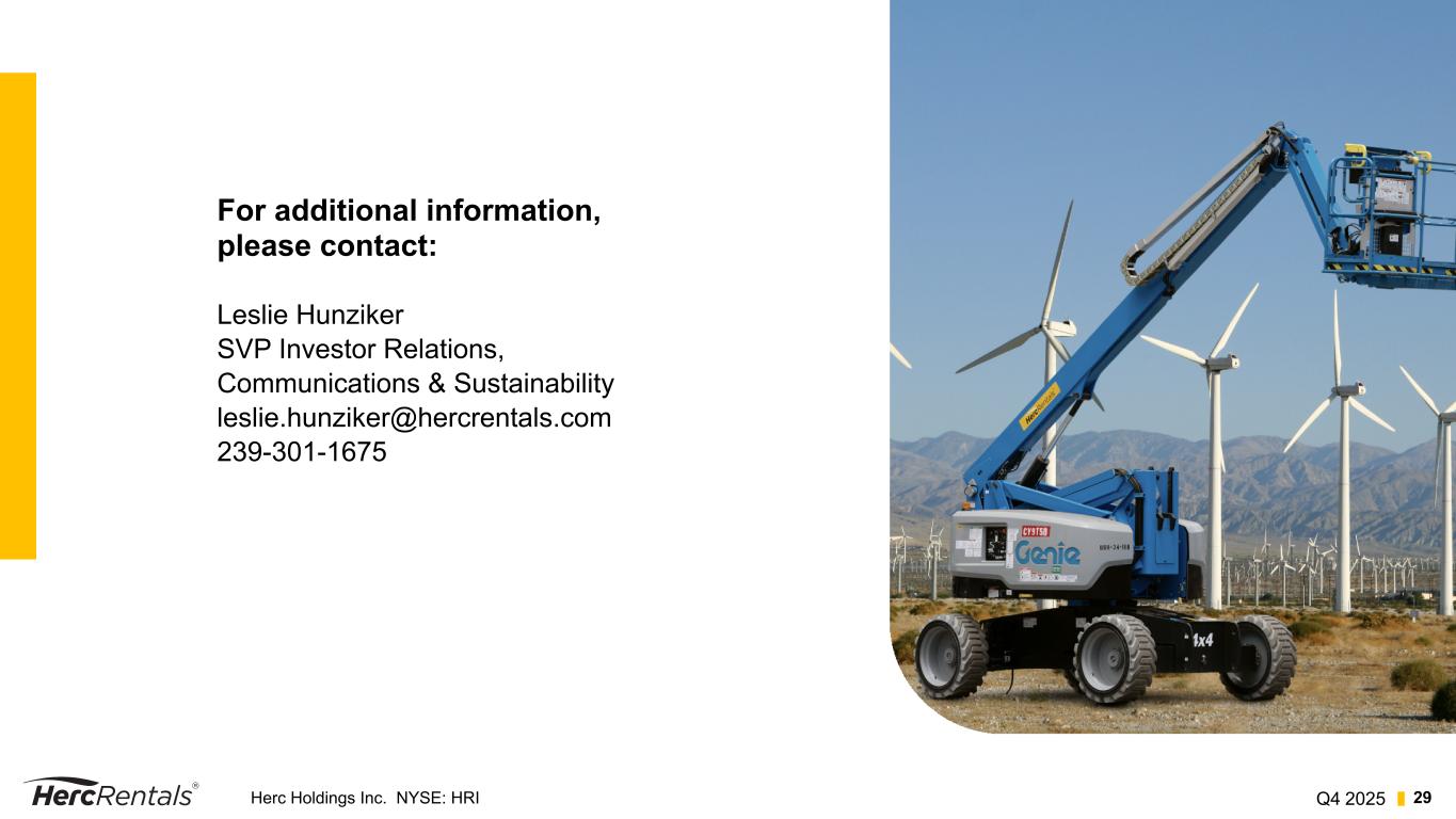 Q4 2025Herc Holdings Inc. NYSE: HRI 29 For additional information, please contact: Leslie Hunziker SVP Investor Relations, Communications & Sustainability leslie.hunziker@hercrentals.com 239-301-1675