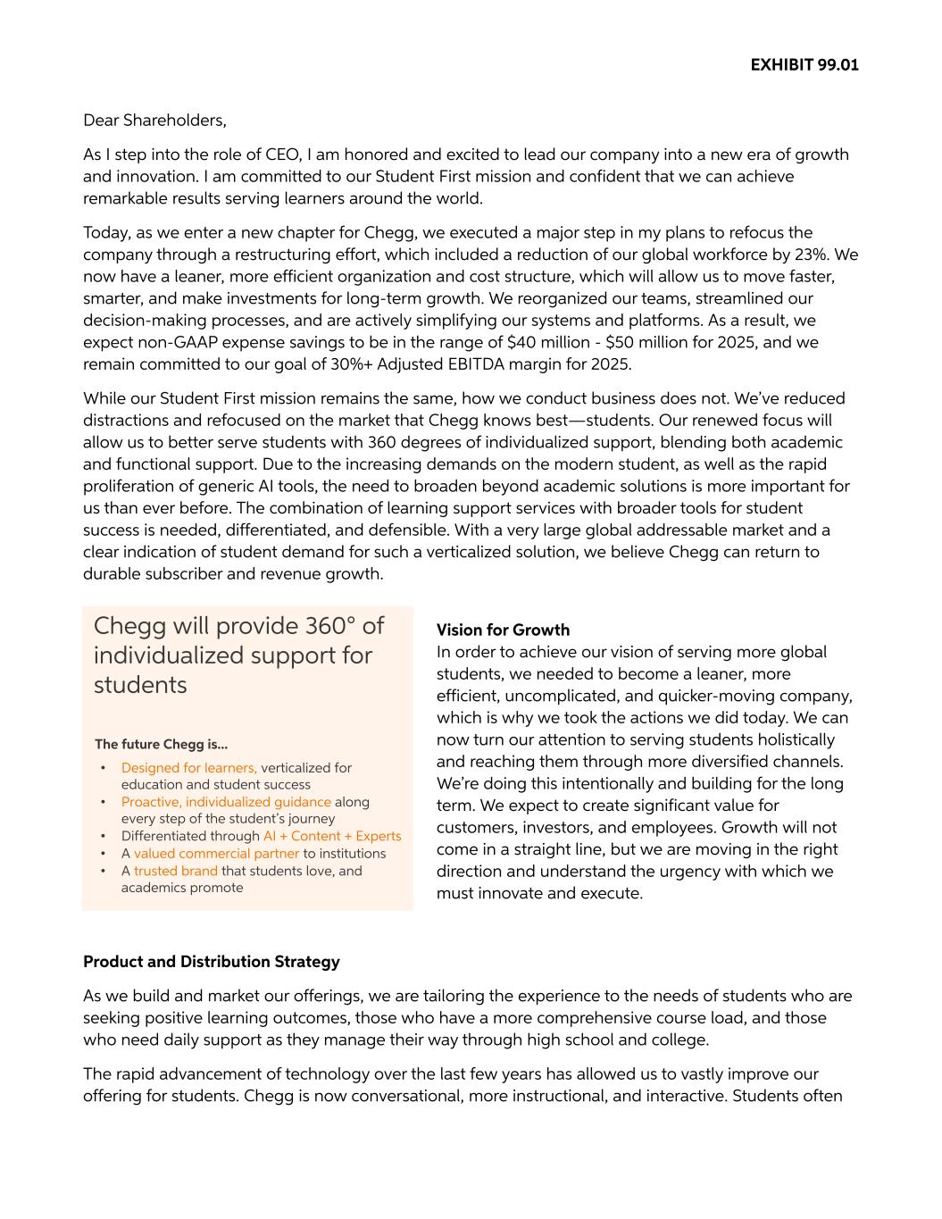 EXHIBIT 99.01 Dear Shareholders, As I step into the role of CEO, I am honored and excited to lead our company into a new era of growth and innovation. I am committed to our Student First mission and confident that we can achieve remarkable results serving learners around the world. Today, as we enter a new chapter for Chegg, we executed a major step in my plans to refocus the company through a restructuring effort, which included a reduction of our global workforce by 23%. We now have a leaner, more efficient organization and cost structure, which will allow us to move faster, smarter, and make investments for long-term growth. We reorganized our teams, streamlined our decision-making processes, and are actively simplifying our systems and platforms. As a result, we expect non-GAAP expense savings to be in the range of $40 million - $50 million for 2025, and we remain committed to our goal of 30%+ Adjusted EBITDA margin for 2025. While our Student First mission remains the same, how we conduct business does not. We’ve reduced distractions and refocused on the market that Chegg knows best—students. Our renewed focus will allow us to better serve students with 360 degrees of individualized support, blending both academic and functional support. Due to the increasing demands on the modern student, as well as the rapid proliferation of generic AI tools, the need to broaden beyond academic solutions is more important for us than ever before. The combination of learning support services with broader tools for student success is needed, differentiated, and defensible. With a very large global addressable market and a clear indication of student demand for such a verticalized solution, we believe Chegg can return to durable subscriber and revenue growth. Vision for Growth In order to achieve our vision of serving more global students, we needed to become a leaner, more efficient, uncomplicated, and quicker-moving company, which is why we took the actions we did today. We can now turn our attention to serving students holistically and reaching them through more diversified channels. We’re doing this intentionally and building for the long term. We expect to create significant value for customers, investors, and employees. Growth will not come in a straight line, but we are moving in the right direction and understand the urgency with which we must innovate and execute. Product and Distribution Strategy As we build and market our offerings, we are tailoring the experience to the needs of students who are seeking positive learning outcomes, those who have a more comprehensive course load, and those who need daily support as they manage their way through high school and college. The rapid advancement of technology over the last few years has allowed us to vastly improve our offering for students. Chegg is now conversational, more instructional, and interactive. Students often Chegg will provide 360° of individualized support for students The future Chegg is... • Designed for learners, verticalized for education and student success • Proactive, individualized guidance along every step of the student’s journey • Differentiated through AI + Content + Experts • A valued commercial partner to institutions • A trusted brand that students love, and academics promote