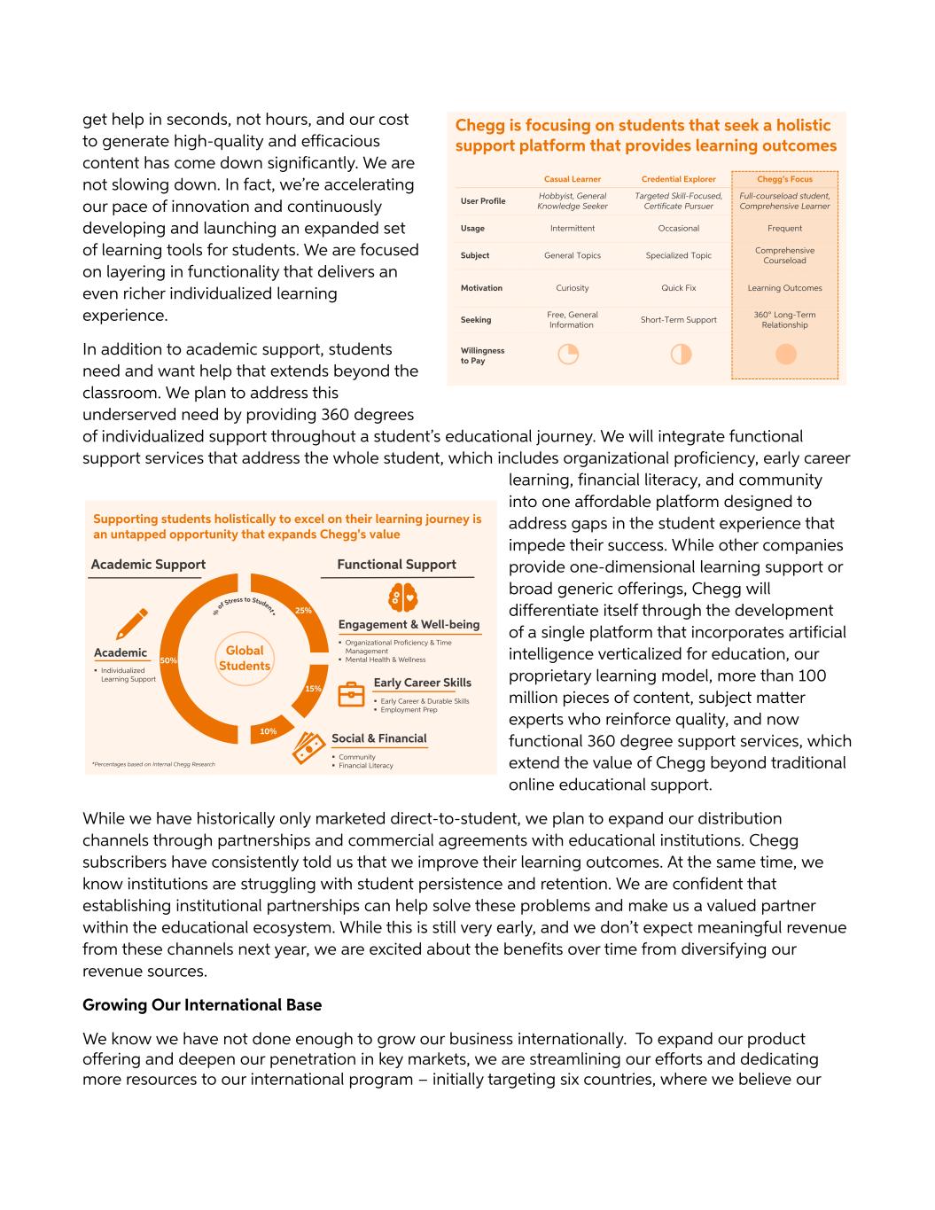 get help in seconds, not hours, and our cost to generate high-quality and efficacious content has come down significantly. We are not slowing down. In fact, we’re accelerating our pace of innovation and continuously developing and launching an expanded set of learning tools for students. We are focused on layering in functionality that delivers an even richer individualized learning experience. In addition to academic support, students need and want help that extends beyond the classroom. We plan to address this underserved need by providing 360 degrees of individualized support throughout a student’s educational journey. We will integrate functional support services that address the whole student, which includes organizational proficiency, early career learning, financial literacy, and community into one affordable platform designed to address gaps in the student experience that impede their success. While other companies provide one-dimensional learning support or broad generic offerings, Chegg will differentiate itself through the development of a single platform that incorporates artificial intelligence verticalized for education, our proprietary learning model, more than 100 million pieces of content, subject matter experts who reinforce quality, and now functional 360 degree support services, which extend the value of Chegg beyond traditional online educational support. While we have historically only marketed direct-to-student, we plan to expand our distribution channels through partnerships and commercial agreements with educational institutions. Chegg subscribers have consistently told us that we improve their learning outcomes. At the same time, we know institutions are struggling with student persistence and retention. We are confident that establishing institutional partnerships can help solve these problems and make us a valued partner within the educational ecosystem. While this is still very early, and we don’t expect meaningful revenue from these channels next year, we are excited about the benefits over time from diversifying our revenue sources. Growing Our International Base We know we have not done enough to grow our business internationally. To expand our product offering and deepen our penetration in key markets, we are streamlining our efforts and dedicating more resources to our international program – initially targeting six countries, where we believe our Chegg is focusing on students that seek a holistic support platform that provides learning outcomes Chegg’s FocusCredential ExplorerCasual Learner Full-courseload student, Comprehensive Learner Targeted Skill-Focused, Certificate Pursuer Hobbyist, General Knowledge Seeker User Profile FrequentOccasionalIntermittentUsage Comprehensive Courseload Specialized TopicGeneral TopicsSubject Learning OutcomesQuick FixCuriosityMotivation 360° Long-Term Relationship Short-Term Support Free, General Information Seeking Willingness to Pay Supporting students holistically to excel on their learning journey is an untapped opportunity that expands Chegg's value Global Students *Percentages based on Internal Chegg Research Academic  Individualized Learning Support Social & Financial  Community  Financial Literacy Early Career Skills  Early Career & Durable Skills  Employment Prep Engagement & Well-being  Organizational Proficiency & Time Management  Mental Health & Wellness 15% 25% 10% 50% Functional SupportAcademic Support
