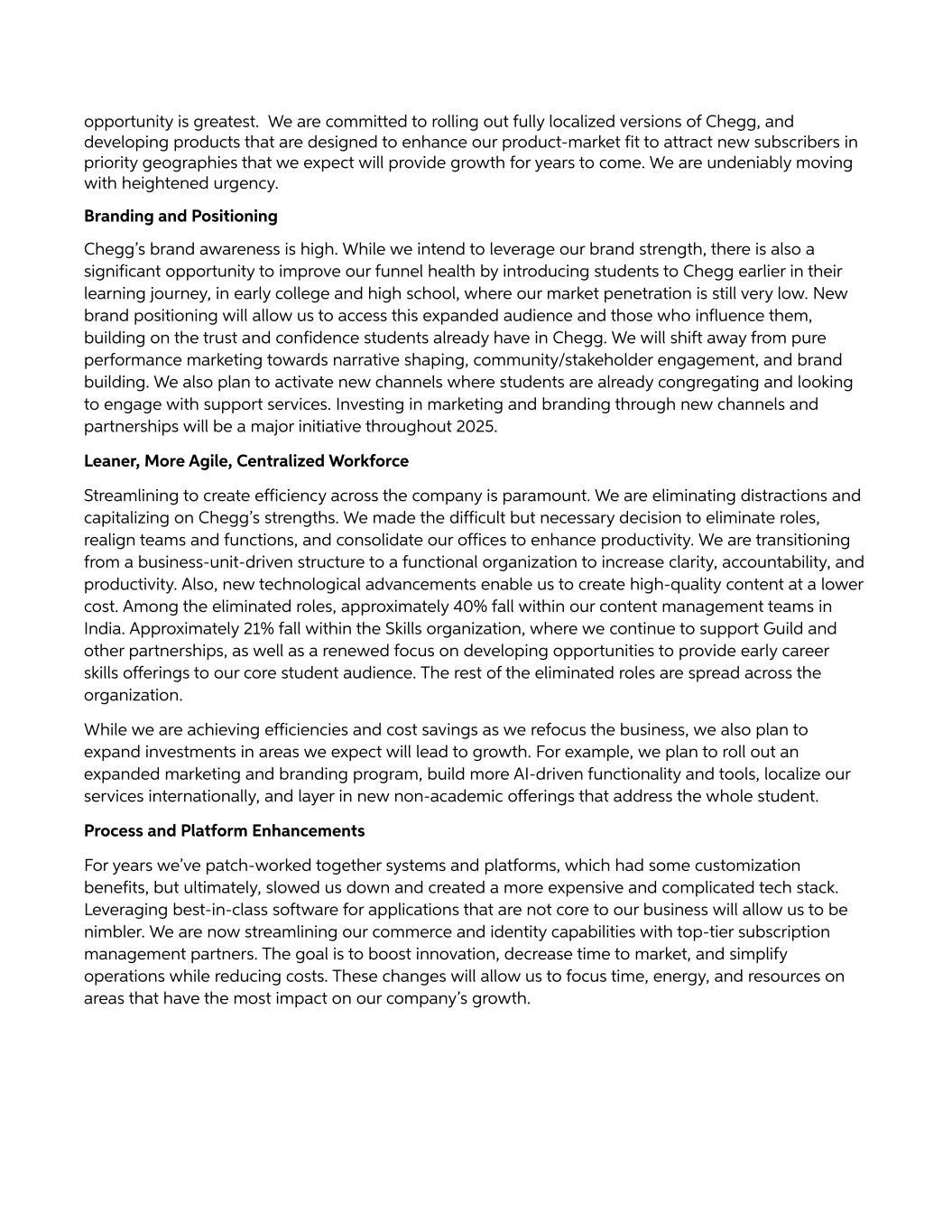 opportunity is greatest. We are committed to rolling out fully localized versions of Chegg, and developing products that are designed to enhance our product-market fit to attract new subscribers in priority geographies that we expect will provide growth for years to come. We are undeniably moving with heightened urgency. Branding and Positioning Chegg’s brand awareness is high. While we intend to leverage our brand strength, there is also a significant opportunity to improve our funnel health by introducing students to Chegg earlier in their learning journey, in early college and high school, where our market penetration is still very low. New brand positioning will allow us to access this expanded audience and those who influence them, building on the trust and confidence students already have in Chegg. We will shift away from pure performance marketing towards narrative shaping, community/stakeholder engagement, and brand building. We also plan to activate new channels where students are already congregating and looking to engage with support services. Investing in marketing and branding through new channels and partnerships will be a major initiative throughout 2025. Leaner, More Agile, Centralized Workforce Streamlining to create efficiency across the company is paramount. We are eliminating distractions and capitalizing on Chegg’s strengths. We made the difficult but necessary decision to eliminate roles, realign teams and functions, and consolidate our offices to enhance productivity. We are transitioning from a business-unit-driven structure to a functional organization to increase clarity, accountability, and productivity. Also, new technological advancements enable us to create high-quality content at a lower cost. Among the eliminated roles, approximately 40% fall within our content management teams in India. Approximately 21% fall within the Skills organization, where we continue to support Guild and other partnerships, as well as a renewed focus on developing opportunities to provide early career skills offerings to our core student audience. The rest of the eliminated roles are spread across the organization. While we are achieving efficiencies and cost savings as we refocus the business, we also plan to expand investments in areas we expect will lead to growth. For example, we plan to roll out an expanded marketing and branding program, build more AI-driven functionality and tools, localize our services internationally, and layer in new non-academic offerings that address the whole student. Process and Platform Enhancements For years we’ve patch-worked together systems and platforms, which had some customization benefits, but ultimately, slowed us down and created a more expensive and complicated tech stack. Leveraging best-in-class software for applications that are not core to our business will allow us to be nimbler. We are now streamlining our commerce and identity capabilities with top-tier subscription management partners. The goal is to boost innovation, decrease time to market, and simplify operations while reducing costs. These changes will allow us to focus time, energy, and resources on areas that have the most impact on our company’s growth.