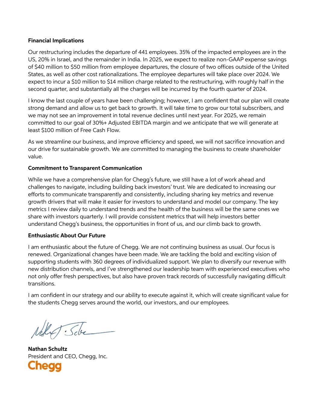 Financial Implications Our restructuring includes the departure of 441 employees. 35% of the impacted employees are in the US, 20% in Israel, and the remainder in India. In 2025, we expect to realize non-GAAP expense savings of $40 million to $50 million from employee departures, the closure of two offices outside of the United States, as well as other cost rationalizations. The employee departures will take place over 2024. We expect to incur a $10 million to $14 million charge related to the restructuring, with roughly half in the second quarter, and substantially all the charges will be incurred by the fourth quarter of 2024. I know the last couple of years have been challenging; however, I am confident that our plan will create strong demand and allow us to get back to growth. It will take time to grow our total subscribers, and we may not see an improvement in total revenue declines until next year. For 2025, we remain committed to our goal of 30%+ Adjusted EBITDA margin and we anticipate that we will generate at least $100 million of Free Cash Flow. As we streamline our business, and improve efficiency and speed, we will not sacrifice innovation and our drive for sustainable growth. We are committed to managing the business to create shareholder value. Commitment to Transparent Communication While we have a comprehensive plan for Chegg’s future, we still have a lot of work ahead and challenges to navigate, including building back investors’ trust. We are dedicated to increasing our efforts to communicate transparently and consistently, including sharing key metrics and revenue growth drivers that will make it easier for investors to understand and model our company. The key metrics I review daily to understand trends and the health of the business will be the same ones we share with investors quarterly. I will provide consistent metrics that will help investors better understand Chegg’s business, the opportunities in front of us, and our climb back to growth. Enthusiastic About Our Future I am enthusiastic about the future of Chegg. We are not continuing business as usual. Our focus is renewed. Organizational changes have been made. We are tackling the bold and exciting vision of supporting students with 360 degrees of individualized support. We plan to diversify our revenue with new distribution channels, and I’ve strengthened our leadership team with experienced executives who not only offer fresh perspectives, but also have proven track records of successfully navigating difficult transitions. I am confident in our strategy and our ability to execute against it, which will create significant value for the students Chegg serves around the world, our investors, and our employees. Nathan Schultz President and CEO, Chegg, Inc.