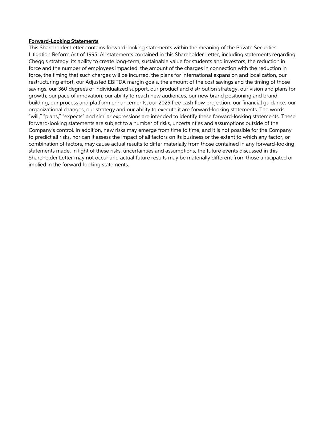 Forward-Looking Statements This Shareholder Letter contains forward-looking statements within the meaning of the Private Securities Litigation Reform Act of 1995. All statements contained in this Shareholder Letter, including statements regarding Chegg's strategy, its ability to create long-term, sustainable value for students and investors, the reduction in force and the number of employees impacted, the amount of the charges in connection with the reduction in force, the timing that such charges will be incurred, the plans for international expansion and localization, our restructuring effort, our Adjusted EBITDA margin goals, the amount of the cost savings and the timing of those savings, our 360 degrees of individualized support, our product and distribution strategy, our vision and plans for growth, our pace of innovation, our ability to reach new audiences, our new brand positioning and brand building, our process and platform enhancements, our 2025 free cash flow projection, our financial guidance, our organizational changes, our strategy and our ability to execute it are forward-looking statements. The words “will,” “plans,” “expects” and similar expressions are intended to identify these forward-looking statements. These forward-looking statements are subject to a number of risks, uncertainties and assumptions outside of the Company's control. In addition, new risks may emerge from time to time, and it is not possible for the Company to predict all risks, nor can it assess the impact of all factors on its business or the extent to which any factor, or combination of factors, may cause actual results to differ materially from those contained in any forward-looking statements made. In light of these risks, uncertainties and assumptions, the future events discussed in this Shareholder Letter may not occur and actual future results may be materially different from those anticipated or implied in the forward-looking statements.