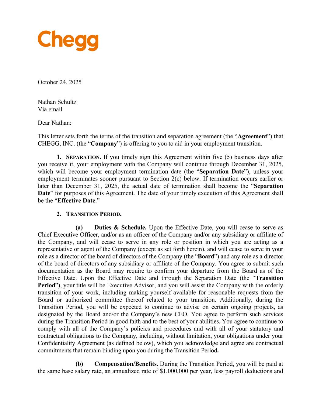October 24, 2025 Nathan Schultz Via email Dear Nathan: This letter sets forth the terms of the transition and separation agreement (the “Agreement”) that CHEGG, INC. (the “Company”) is offering to you to aid in your employment transition. 1. SEPARATION. If you timely sign this Agreement within five (5) business days after you receive it, your employment with the Company will continue through December 31, 2025, which will become your employment termination date (the “Separation Date”), unless your employment terminates sooner pursuant to Section 2(c) below. If termination occurs earlier or later than December 31, 2025, the actual date of termination shall become the “Separation Date” for purposes of this Agreement. The date of your timely execution of this Agreement shall be the “Effective Date.” 2. TRANSITION PERIOD. (a) Duties & Schedule. Upon the Effective Date, you will cease to serve as Chief Executive Officer, and/or as an officer of the Company and/or any subsidiary or affiliate of the Company, and will cease to serve in any role or position in which you are acting as a representative or agent of the Company (except as set forth herein), and will cease to serve in your role as a director of the board of directors of the Company (the “Board”) and any role as a director of the board of directors of any subsidiary or affiliate of the Company. You agree to submit such documentation as the Board may require to confirm your departure from the Board as of the Effective Date. Upon the Effective Date and through the Separation Date (the “Transition Period”), your title will be Executive Advisor, and you will assist the Company with the orderly transition of your work, including making yourself available for reasonable requests from the Board or authorized committee thereof related to your transition. Additionally, during the Transition Period, you will be expected to continue to advise on certain ongoing projects, as designated by the Board and/or the Company’s new CEO. You agree to perform such services during the Transition Period in good faith and to the best of your abilities. You agree to continue to comply with all of the Company’s policies and procedures and with all of your statutory and contractual obligations to the Company, including, without limitation, your obligations under your Confidentiality Agreement (as defined below), which you acknowledge and agree are contractual commitments that remain binding upon you during the Transition Period. (b) Compensation/Benefits. During the Transition Period, you will be paid at the same base salary rate, an annualized rate of $1,000,000 per year, less payroll deductions and