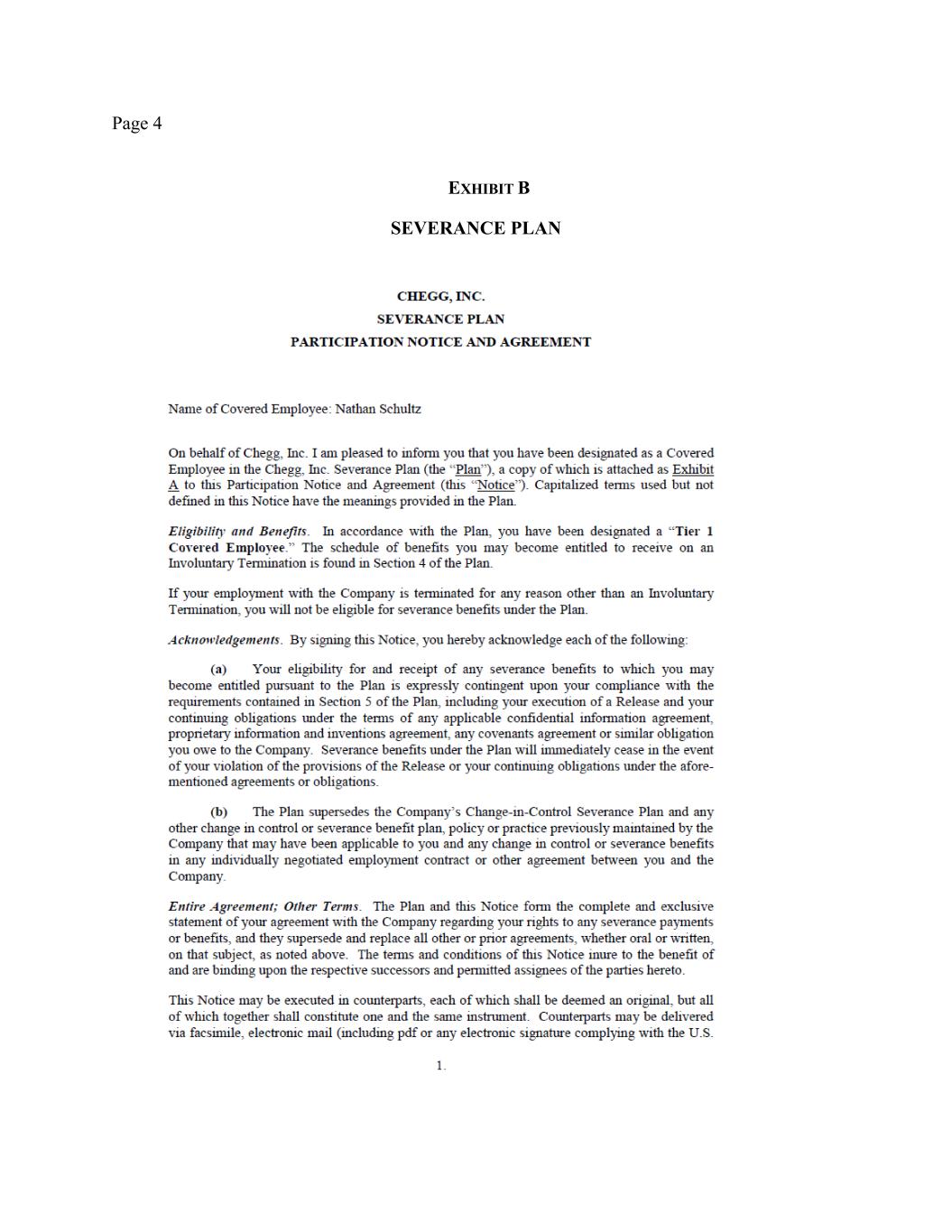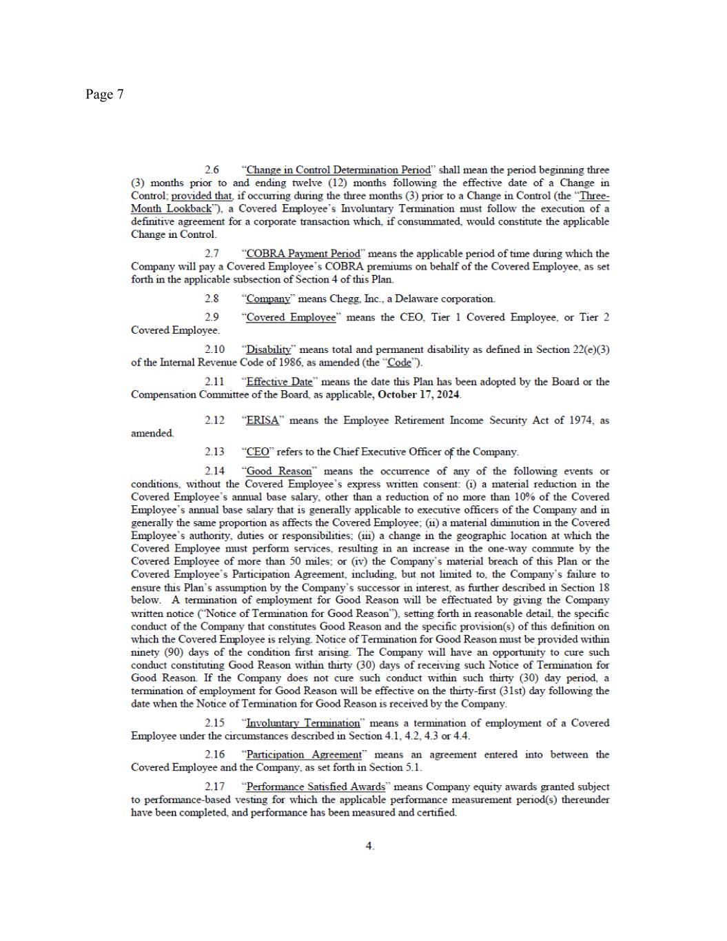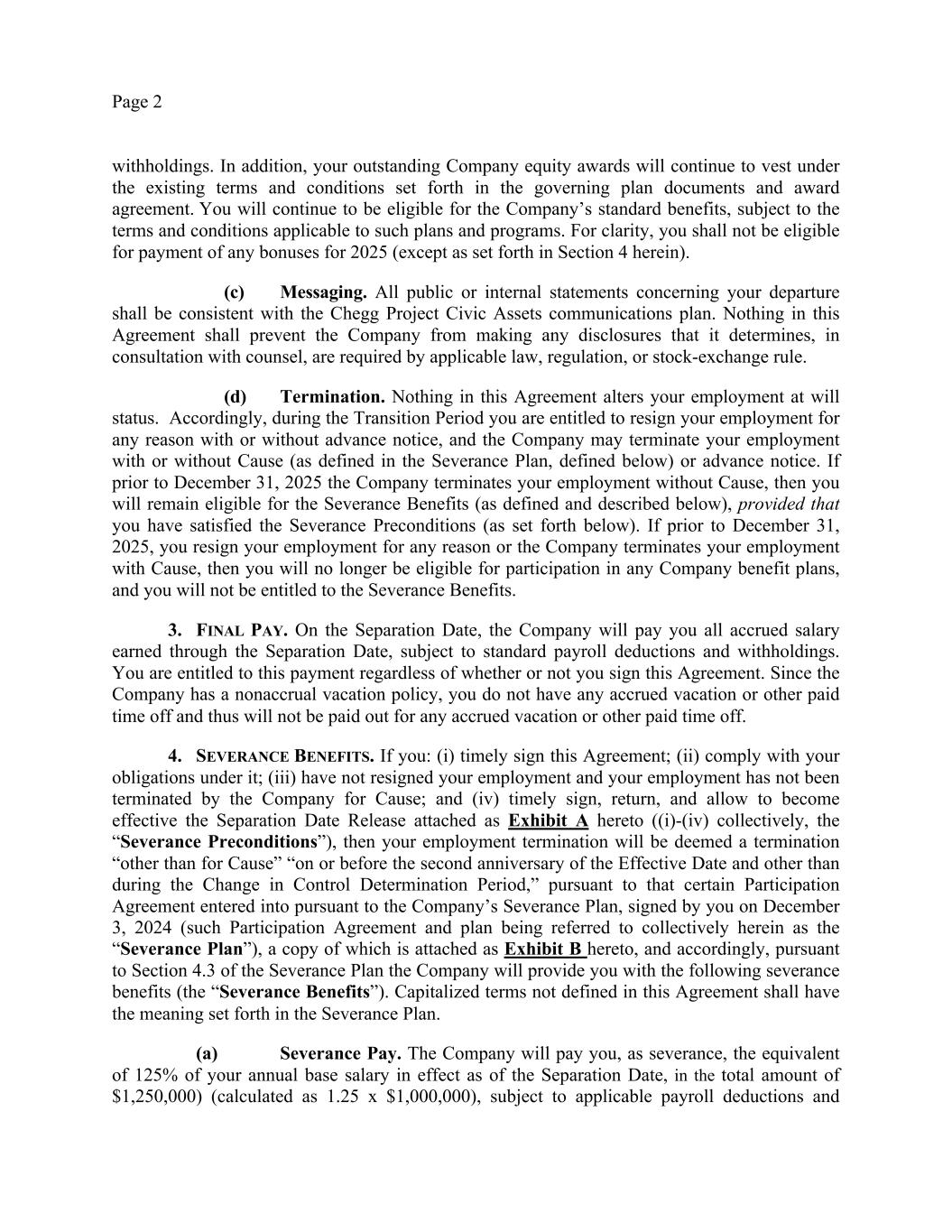 Page 2 withholdings. In addition, your outstanding Company equity awards will continue to vest under the existing terms and conditions set forth in the governing plan documents and award agreement. You will continue to be eligible for the Company’s standard benefits, subject to the terms and conditions applicable to such plans and programs. For clarity, you shall not be eligible for payment of any bonuses for 2025 (except as set forth in Section 4 herein). (c) Messaging. All public or internal statements concerning your departure shall be consistent with the Chegg Project Civic Assets communications plan. Nothing in this Agreement shall prevent the Company from making any disclosures that it determines, in consultation with counsel, are required by applicable law, regulation, or stock-exchange rule. (d) Termination. Nothing in this Agreement alters your employment at will status. Accordingly, during the Transition Period you are entitled to resign your employment for any reason with or without advance notice, and the Company may terminate your employment with or without Cause (as defined in the Severance Plan, defined below) or advance notice. If prior to December 31, 2025 the Company terminates your employment without Cause, then you will remain eligible for the Severance Benefits (as defined and described below), provided that you have satisfied the Severance Preconditions (as set forth below). If prior to December 31, 2025, you resign your employment for any reason or the Company terminates your employment with Cause, then you will no longer be eligible for participation in any Company benefit plans, and you will not be entitled to the Severance Benefits. 3. FINAL PAY. On the Separation Date, the Company will pay you all accrued salary earned through the Separation Date, subject to standard payroll deductions and withholdings. You are entitled to this payment regardless of whether or not you sign this Agreement. Since the Company has a nonaccrual vacation policy, you do not have any accrued vacation or other paid time off and thus will not be paid out for any accrued vacation or other paid time off. 4. SEVERANCE BENEFITS. If you: (i) timely sign this Agreement; (ii) comply with your obligations under it; (iii) have not resigned your employment and your employment has not been terminated by the Company for Cause; and (iv) timely sign, return, and allow to become effective the Separation Date Release attached as Exhibit A hereto ((i)-(iv) collectively, the “Severance Preconditions”), then your employment termination will be deemed a termination “other than for Cause” “on or before the second anniversary of the Effective Date and other than during the Change in Control Determination Period,” pursuant to that certain Participation Agreement entered into pursuant to the Company’s Severance Plan, signed by you on December 3, 2024 (such Participation Agreement and plan being referred to collectively herein as the “Severance Plan”), a copy of which is attached as Exhibit B hereto, and accordingly, pursuant to Section 4.3 of the Severance Plan the Company will provide you with the following severance benefits (the “Severance Benefits”). Capitalized terms not defined in this Agreement shall have the meaning set forth in the Severance Plan. (a) Severance Pay. The Company will pay you, as severance, the equivalent of 125% of your annual base salary in effect as of the Separation Date, in the total amount of $1,250,000) (calculated as 1.25 x $1,000,000), subject to applicable payroll deductions and