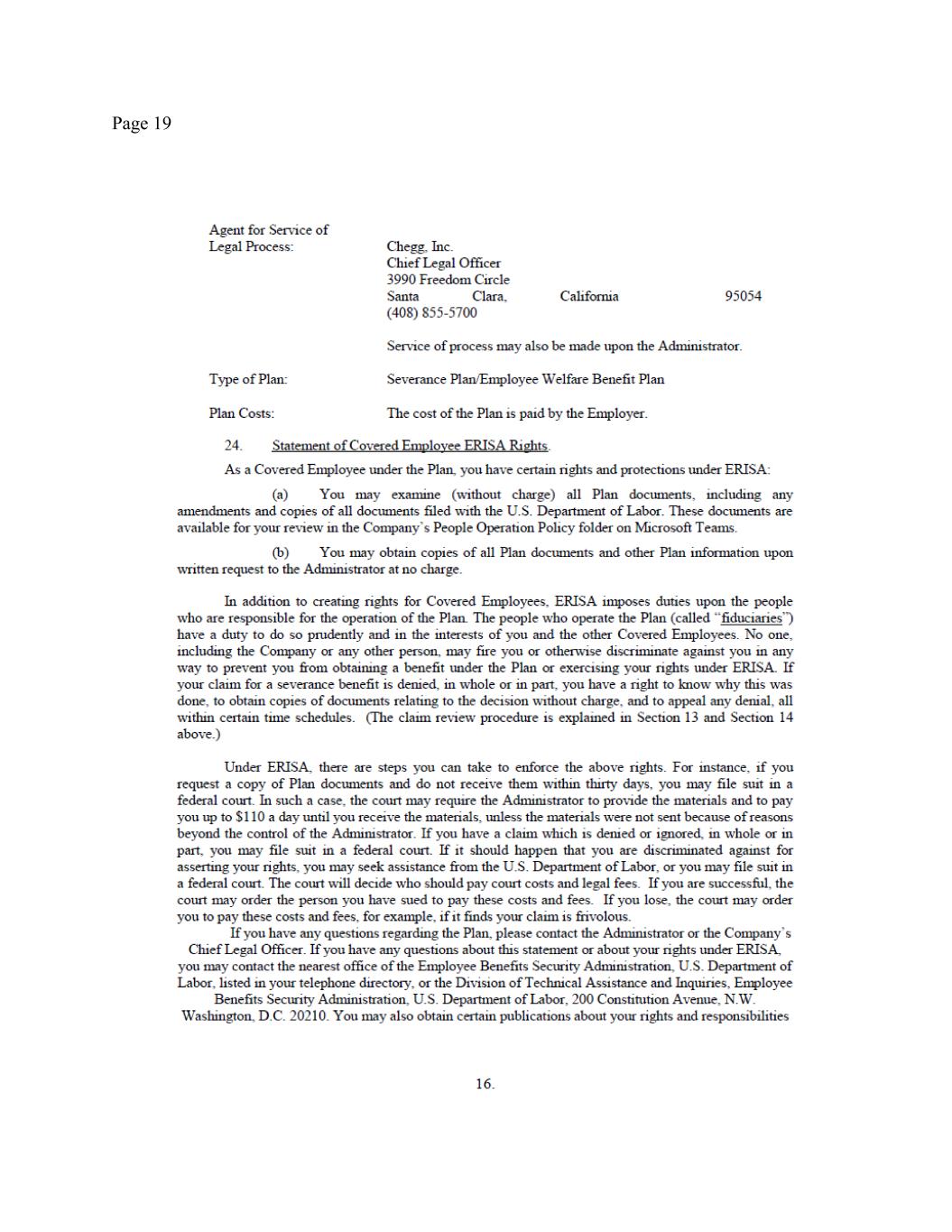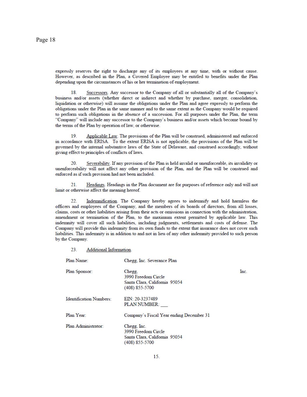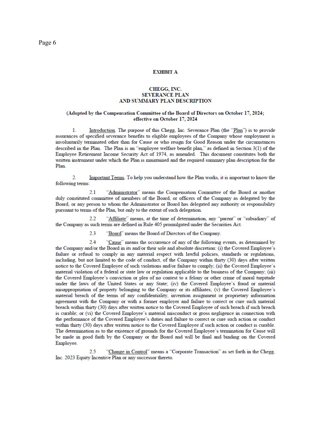 Page 2 withholdings. In addition, your outstanding Company equity awards will continue to vest under the existing terms and conditions set forth in the governing plan documents and award agreement. You will continue to be eligible for the Company’s standard benefits, subject to the terms and conditions applicable to such plans and programs. For clarity, you shall not be eligible for payment of any bonuses for 2025 (except as set forth in Section 4 herein). (c) Messaging. All public or internal statements concerning your departure shall be consistent with the Chegg Project Civic Assets communications plan. Nothing in this Agreement shall prevent the Company from making any disclosures that it determines, in consultation with counsel, are required by applicable law, regulation, or stock-exchange rule. (d) Termination. Nothing in this Agreement alters your employment at will status. Accordingly, during the Transition Period you are entitled to resign your employment for any reason with or without advance notice, and the Company may terminate your employment with or without Cause (as defined in the Severance Plan, defined below) or advance notice. If prior to December 31, 2025 the Company terminates your employment without Cause, then you will remain eligible for the Severance Benefits (as defined and described below), provided that you have satisfied the Severance Preconditions (as set forth below). If prior to December 31, 2025, you resign your employment for any reason or the Company terminates your employment with Cause, then you will no longer be eligible for participation in any Company benefit plans, and you will not be entitled to the Severance Benefits. 3. FINAL PAY. On the Separation Date, the Company will pay you all accrued salary earned through the Separation Date, subject to standard payroll deductions and withholdings. You are entitled to this payment regardless of whether or not you sign this Agreement. Since the Company has a nonaccrual vacation policy, you do not have any accrued vacation or other paid time off and thus will not be paid out for any accrued vacation or other paid time off. 4. SEVERANCE BENEFITS. If you: (i) timely sign this Agreement; (ii) comply with your obligations under it; (iii) have not resigned your employment and your employment has not been terminated by the Company for Cause; and (iv) timely sign, return, and allow to become effective the Separation Date Release attached as Exhibit A hereto ((i)-(iv) collectively, the “Severance Preconditions”), then your employment termination will be deemed a termination “other than for Cause” “on or before the second anniversary of the Effective Date and other than during the Change in Control Determination Period,” pursuant to that certain Participation Agreement entered into pursuant to the Company’s Severance Plan, signed by you on December 3, 2024 (such Participation Agreement and plan being referred to collectively herein as the “Severance Plan”), a copy of which is attached as Exhibit B hereto, and accordingly, pursuant to Section 4.3 of the Severance Plan the Company will provide you with the following severance benefits (the “Severance Benefits”). Capitalized terms not defined in this Agreement shall have the meaning set forth in the Severance Plan. (a) Severance Pay. The Company will pay you, as severance, the equivalent of 125% of your annual base salary in effect as of the Separation Date, in the total amount of $1,250,000) (calculated as 1.25 x $1,000,000), subject to applicable payroll deductions and