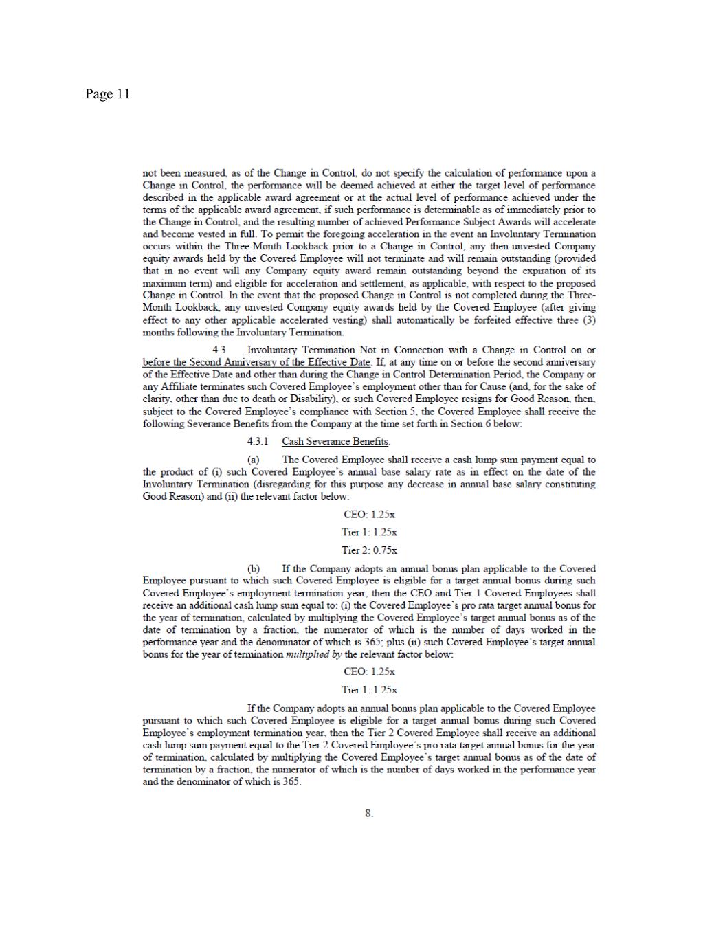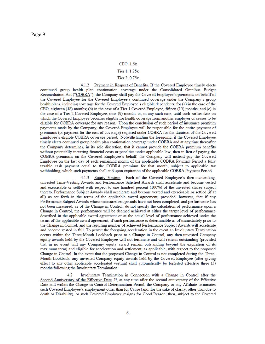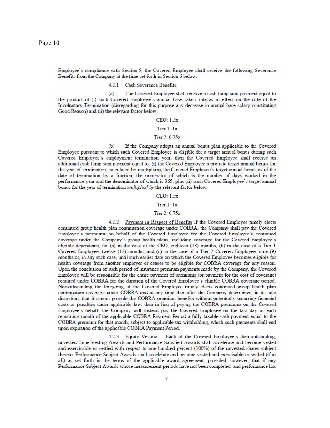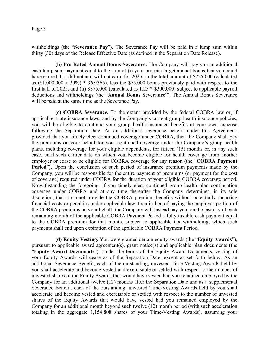 Page 3 withholdings (the “Severance Pay”). The Severance Pay will be paid in a lump sum within thirty (30) days of the Release Effective Date (as defined in the Separation Date Release). (b) Pro Rated Annual Bonus Severance. The Company will pay you an additional cash lump sum payment equal to the sum of (i) your pro rata target annual bonus that you could have earned, but did not and will not earn, for 2025, in the total amount of $225,000 (calculated as ($1,000,000 x 30%) * 365/365), less the $75,000 bonus previously paid with respect to the first half of 2025, and (ii) $375,000 (calculated as 1.25 * $300,000) subject to applicable payroll deductions and withholdings (the “Annual Bonus Severance”). The Annual Bonus Severance will be paid at the same time as the Severance Pay. (c) COBRA Severance. To the extent provided by the federal COBRA law or, if applicable, state insurance laws, and by the Company’s current group health insurance policies, you will be eligible to continue your group health insurance benefits at your own expense following the Separation Date. As an additional severance benefit under this Agreement, provided that you timely elect continued coverage under COBRA, then the Company shall pay the premiums on your behalf for your continued coverage under the Company’s group health plans, including coverage for your eligible dependents, for fifteen (15) months or, in any such case, until such earlier date on which you become eligible for health coverage from another employer or cease to be eligible for COBRA coverage for any reason (the “COBRA Payment Period”). Upon the conclusion of such period of insurance premium payments made by the Company, you will be responsible for the entire payment of premiums (or payment for the cost of coverage) required under COBRA for the duration of your eligible COBRA coverage period. Notwithstanding the foregoing, if you timely elect continued group health plan continuation coverage under COBRA and at any time thereafter the Company determines, in its sole discretion, that it cannot provide the COBRA premium benefits without potentially incurring financial costs or penalties under applicable law, then in lieu of paying the employer portion of the COBRA premiums on your behalf, the Company will instead pay you, on the last day of each remaining month of the applicable COBRA Payment Period a fully taxable cash payment equal to the COBRA premium for that month, subject to applicable tax withholding, which such payments shall end upon expiration of the applicable COBRA Payment Period. (d) Equity Vesting. You were granted certain equity awards (the “Equity Awards”), pursuant to applicable award agreement(s), grant notice(s) and applicable plan documents (the “Equity Award Documents”). Under the terms of the Equity Award Documents, vesting of your Equity Awards will cease as of the Separation Date, except as set forth below. As an additional Severance Benefit, each of the outstanding, unvested Time-Vesting Awards held by you shall accelerate and become vested and exercisable or settled with respect to the number of unvested shares of the Equity Awards that would have vested had you remained employed by the Company for an additional twelve (12) months after the Separation Date and as a supplemental Severance Benefit, each of the outstanding, unvested Time-Vesting Awards held by you shall accelerate and become vested and exercisable or settled with respect to the number of unvested shares of the Equity Awards that would have vested had you remained employed by the Company for an additional month beyond such twelve (12) month period (with such acceleration totaling in the aggregate 1,154,808 shares of your Time-Vesting Awards), assuming your