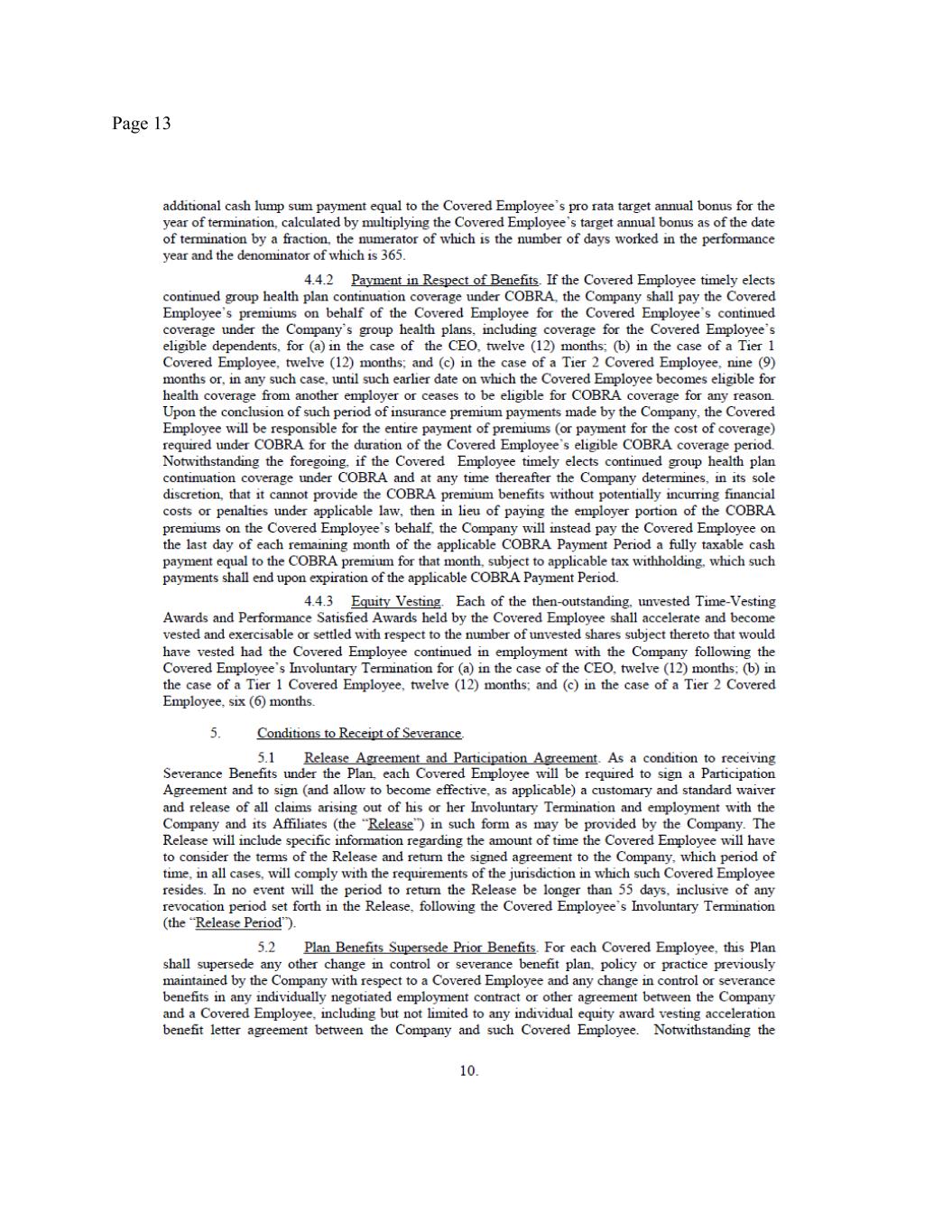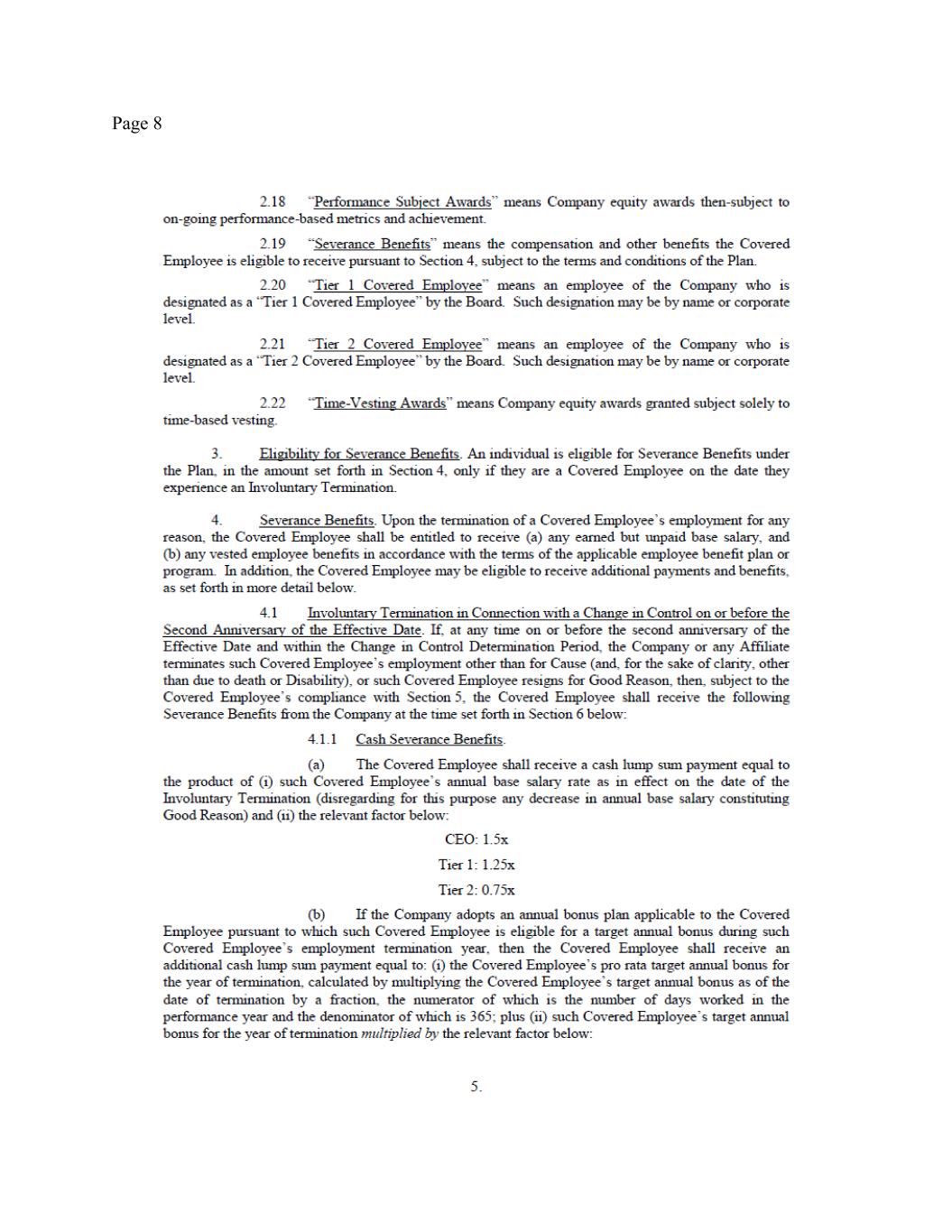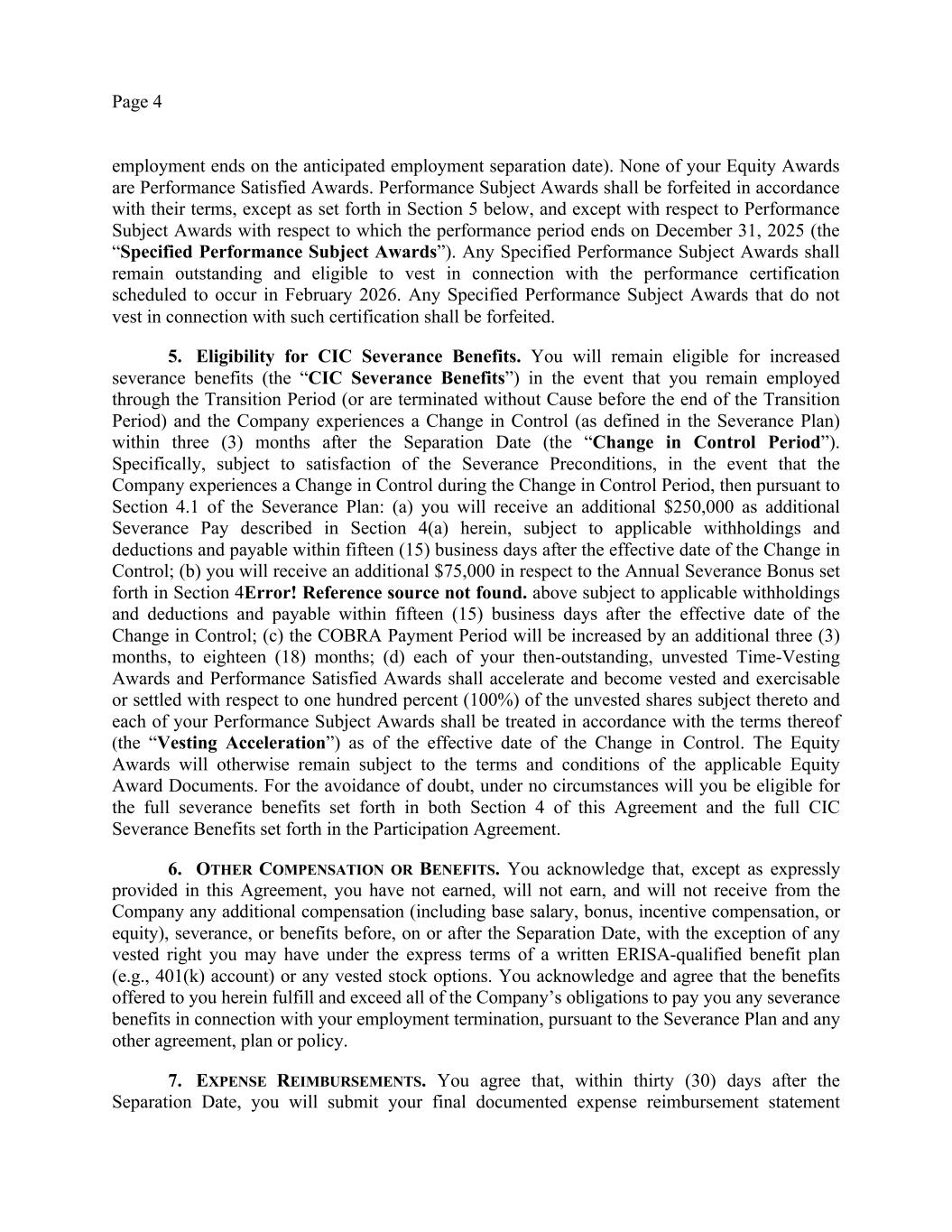 Page 4 employment ends on the anticipated employment separation date). None of your Equity Awards are Performance Satisfied Awards. Performance Subject Awards shall be forfeited in accordance with their terms, except as set forth in Section 5 below, and except with respect to Performance Subject Awards with respect to which the performance period ends on December 31, 2025 (the “Specified Performance Subject Awards”). Any Specified Performance Subject Awards shall remain outstanding and eligible to vest in connection with the performance certification scheduled to occur in February 2026. Any Specified Performance Subject Awards that do not vest in connection with such certification shall be forfeited. 5. Eligibility for CIC Severance Benefits. You will remain eligible for increased severance benefits (the “CIC Severance Benefits”) in the event that you remain employed through the Transition Period (or are terminated without Cause before the end of the Transition Period) and the Company experiences a Change in Control (as defined in the Severance Plan) within three (3) months after the Separation Date (the “Change in Control Period”). Specifically, subject to satisfaction of the Severance Preconditions, in the event that the Company experiences a Change in Control during the Change in Control Period, then pursuant to Section 4.1 of the Severance Plan: (a) you will receive an additional $250,000 as additional Severance Pay described in Section 4(a) herein, subject to applicable withholdings and deductions and payable within fifteen (15) business days after the effective date of the Change in Control; (b) you will receive an additional $75,000 in respect to the Annual Severance Bonus set forth in Section 4Error! Reference source not found. above subject to applicable withholdings and deductions and payable within fifteen (15) business days after the effective date of the Change in Control; (c) the COBRA Payment Period will be increased by an additional three (3) months, to eighteen (18) months; (d) each of your then-outstanding, unvested Time-Vesting Awards and Performance Satisfied Awards shall accelerate and become vested and exercisable or settled with respect to one hundred percent (100%) of the unvested shares subject thereto and each of your Performance Subject Awards shall be treated in accordance with the terms thereof (the “Vesting Acceleration”) as of the effective date of the Change in Control. The Equity Awards will otherwise remain subject to the terms and conditions of the applicable Equity Award Documents. For the avoidance of doubt, under no circumstances will you be eligible for the full severance benefits set forth in both Section 4 of this Agreement and the full CIC Severance Benefits set forth in the Participation Agreement. 6. OTHER COMPENSATION OR BENEFITS. You acknowledge that, except as expressly provided in this Agreement, you have not earned, will not earn, and will not receive from the Company any additional compensation (including base salary, bonus, incentive compensation, or equity), severance, or benefits before, on or after the Separation Date, with the exception of any vested right you may have under the express terms of a written ERISA-qualified benefit plan (e.g., 401(k) account) or any vested stock options. You acknowledge and agree that the benefits offered to you herein fulfill and exceed all of the Company’s obligations to pay you any severance benefits in connection with your employment termination, pursuant to the Severance Plan and any other agreement, plan or policy. 7. EXPENSE REIMBURSEMENTS. You agree that, within thirty (30) days after the Separation Date, you will submit your final documented expense reimbursement statement