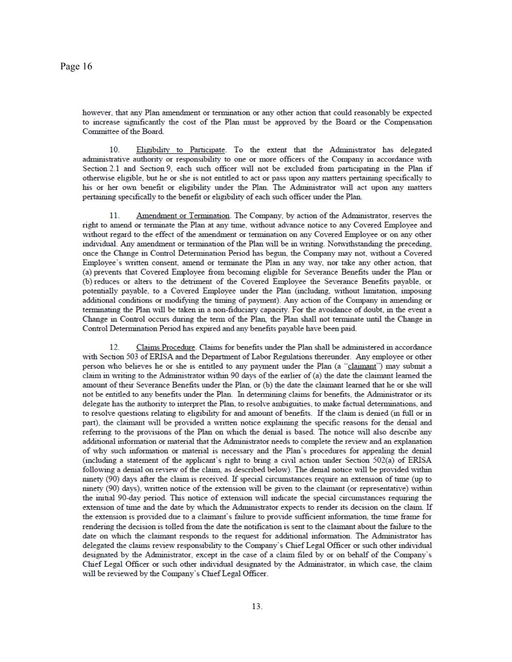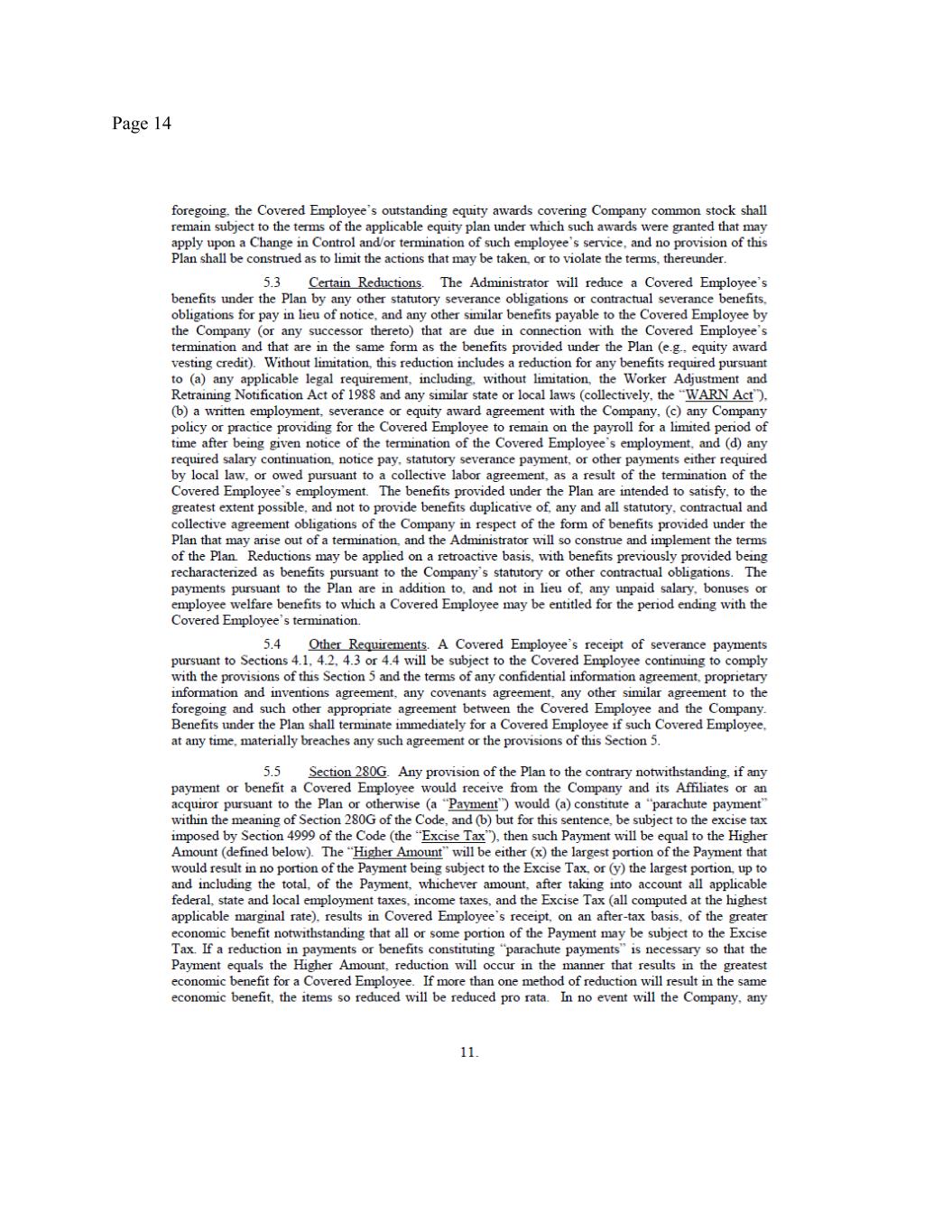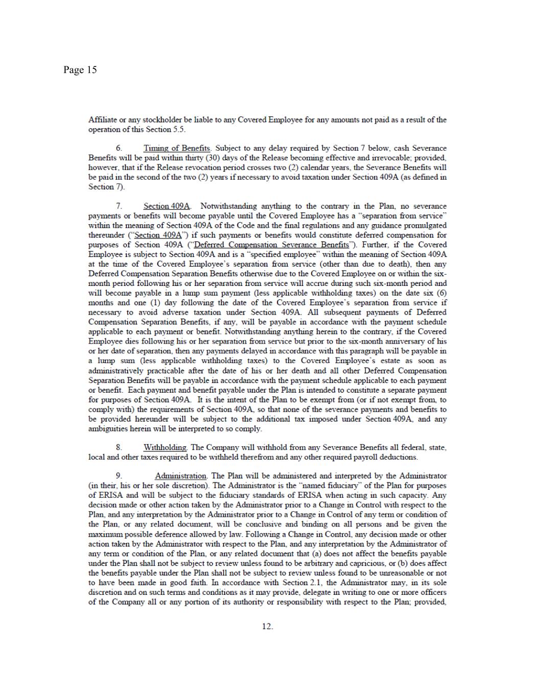 Page 4 employment ends on the anticipated employment separation date). None of your Equity Awards are Performance Satisfied Awards. Performance Subject Awards shall be forfeited in accordance with their terms, except as set forth in Section 5 below, and except with respect to Performance Subject Awards with respect to which the performance period ends on December 31, 2025 (the “Specified Performance Subject Awards”). Any Specified Performance Subject Awards shall remain outstanding and eligible to vest in connection with the performance certification scheduled to occur in February 2026. Any Specified Performance Subject Awards that do not vest in connection with such certification shall be forfeited. 5. Eligibility for CIC Severance Benefits. You will remain eligible for increased severance benefits (the “CIC Severance Benefits”) in the event that you remain employed through the Transition Period (or are terminated without Cause before the end of the Transition Period) and the Company experiences a Change in Control (as defined in the Severance Plan) within three (3) months after the Separation Date (the “Change in Control Period”). Specifically, subject to satisfaction of the Severance Preconditions, in the event that the Company experiences a Change in Control during the Change in Control Period, then pursuant to Section 4.1 of the Severance Plan: (a) you will receive an additional $250,000 as additional Severance Pay described in Section 4(a) herein, subject to applicable withholdings and deductions and payable within fifteen (15) business days after the effective date of the Change in Control; (b) you will receive an additional $75,000 in respect to the Annual Severance Bonus set forth in Section 4Error! Reference source not found. above subject to applicable withholdings and deductions and payable within fifteen (15) business days after the effective date of the Change in Control; (c) the COBRA Payment Period will be increased by an additional three (3) months, to eighteen (18) months; (d) each of your then-outstanding, unvested Time-Vesting Awards and Performance Satisfied Awards shall accelerate and become vested and exercisable or settled with respect to one hundred percent (100%) of the unvested shares subject thereto and each of your Performance Subject Awards shall be treated in accordance with the terms thereof (the “Vesting Acceleration”) as of the effective date of the Change in Control. The Equity Awards will otherwise remain subject to the terms and conditions of the applicable Equity Award Documents. For the avoidance of doubt, under no circumstances will you be eligible for the full severance benefits set forth in both Section 4 of this Agreement and the full CIC Severance Benefits set forth in the Participation Agreement. 6. OTHER COMPENSATION OR BENEFITS. You acknowledge that, except as expressly provided in this Agreement, you have not earned, will not earn, and will not receive from the Company any additional compensation (including base salary, bonus, incentive compensation, or equity), severance, or benefits before, on or after the Separation Date, with the exception of any vested right you may have under the express terms of a written ERISA-qualified benefit plan (e.g., 401(k) account) or any vested stock options. You acknowledge and agree that the benefits offered to you herein fulfill and exceed all of the Company’s obligations to pay you any severance benefits in connection with your employment termination, pursuant to the Severance Plan and any other agreement, plan or policy. 7. EXPENSE REIMBURSEMENTS. You agree that, within thirty (30) days after the Separation Date, you will submit your final documented expense reimbursement statement