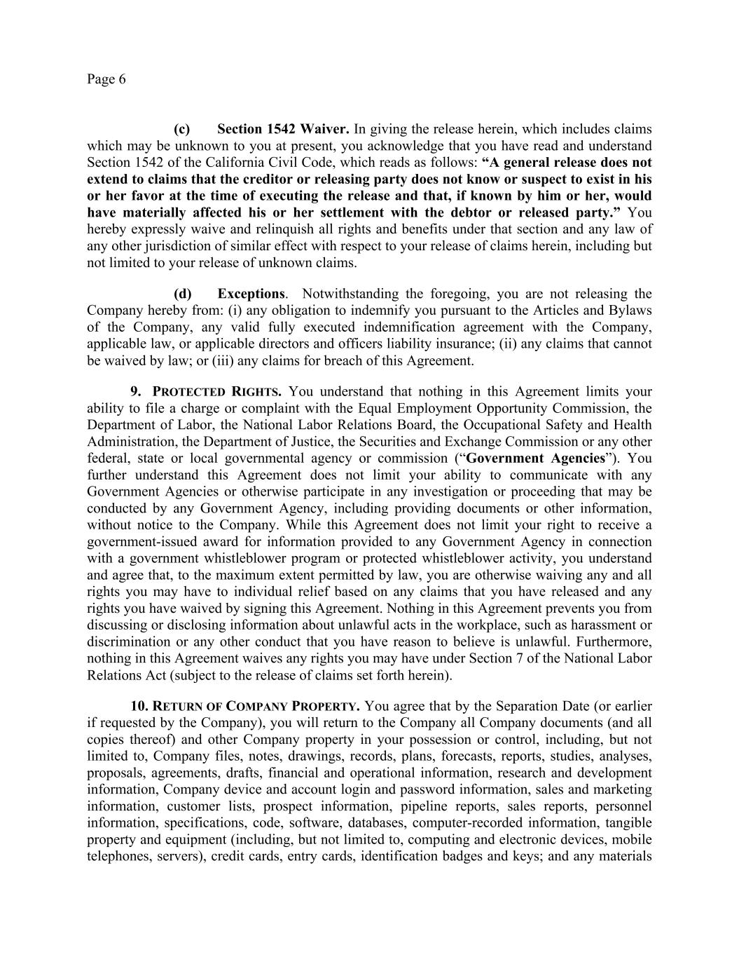 Page 6 (c) Section 1542 Waiver. In giving the release herein, which includes claims which may be unknown to you at present, you acknowledge that you have read and understand Section 1542 of the California Civil Code, which reads as follows: “A general release does not extend to claims that the creditor or releasing party does not know or suspect to exist in his or her favor at the time of executing the release and that, if known by him or her, would have materially affected his or her settlement with the debtor or released party.” You hereby expressly waive and relinquish all rights and benefits under that section and any law of any other jurisdiction of similar effect with respect to your release of claims herein, including but not limited to your release of unknown claims. (d) Exceptions. Notwithstanding the foregoing, you are not releasing the Company hereby from: (i) any obligation to indemnify you pursuant to the Articles and Bylaws of the Company, any valid fully executed indemnification agreement with the Company, applicable law, or applicable directors and officers liability insurance; (ii) any claims that cannot be waived by law; or (iii) any claims for breach of this Agreement. 9. PROTECTED RIGHTS. You understand that nothing in this Agreement limits your ability to file a charge or complaint with the Equal Employment Opportunity Commission, the Department of Labor, the National Labor Relations Board, the Occupational Safety and Health Administration, the Department of Justice, the Securities and Exchange Commission or any other federal, state or local governmental agency or commission (“Government Agencies”). You further understand this Agreement does not limit your ability to communicate with any Government Agencies or otherwise participate in any investigation or proceeding that may be conducted by any Government Agency, including providing documents or other information, without notice to the Company. While this Agreement does not limit your right to receive a government-issued award for information provided to any Government Agency in connection with a government whistleblower program or protected whistleblower activity, you understand and agree that, to the maximum extent permitted by law, you are otherwise waiving any and all rights you may have to individual relief based on any claims that you have released and any rights you have waived by signing this Agreement. Nothing in this Agreement prevents you from discussing or disclosing information about unlawful acts in the workplace, such as harassment or discrimination or any other conduct that you have reason to believe is unlawful. Furthermore, nothing in this Agreement waives any rights you may have under Section 7 of the National Labor Relations Act (subject to the release of claims set forth herein). 10. RETURN OF COMPANY PROPERTY. You agree that by the Separation Date (or earlier if requested by the Company), you will return to the Company all Company documents (and all copies thereof) and other Company property in your possession or control, including, but not limited to, Company files, notes, drawings, records, plans, forecasts, reports, studies, analyses, proposals, agreements, drafts, financial and operational information, research and development information, Company device and account login and password information, sales and marketing information, customer lists, prospect information, pipeline reports, sales reports, personnel information, specifications, code, software, databases, computer-recorded information, tangible property and equipment (including, but not limited to, computing and electronic devices, mobile telephones, servers), credit cards, entry cards, identification badges and keys; and any materials