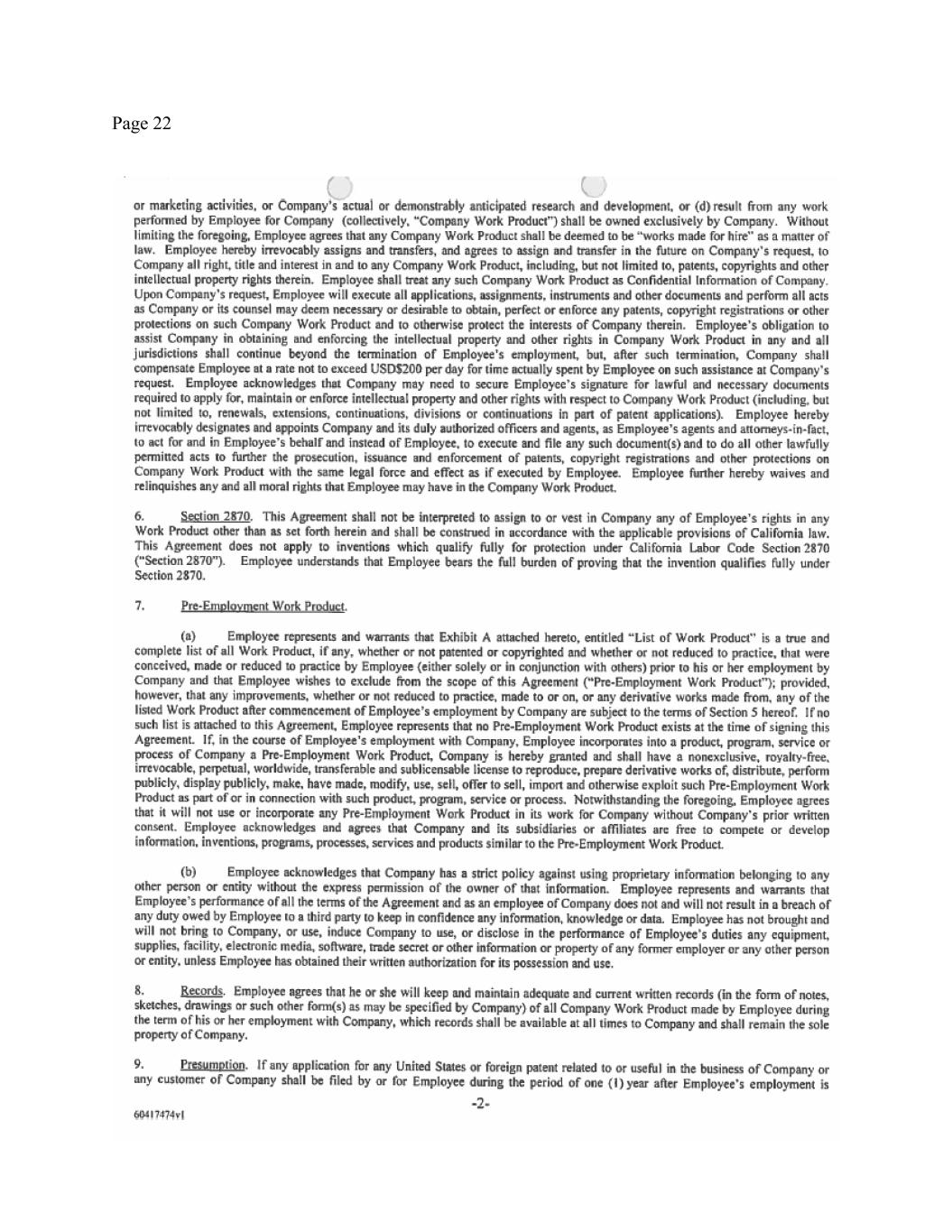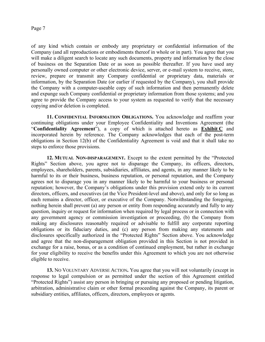Page 7 of any kind which contain or embody any proprietary or confidential information of the Company (and all reproductions or embodiments thereof in whole or in part). You agree that you will make a diligent search to locate any such documents, property and information by the close of business on the Separation Date or as soon as possible thereafter. If you have used any personally owned computer or other electronic device, server, or e-mail system to receive, store, review, prepare or transmit any Company confidential or proprietary data, materials or information, by the Separation Date (or earlier if requested by the Company), you shall provide the Company with a computer-useable copy of such information and then permanently delete and expunge such Company confidential or proprietary information from those systems; and you agree to provide the Company access to your system as requested to verify that the necessary copying and/or deletion is completed. 11. CONFIDENTIAL INFORMATION OBLIGATIONS. You acknowledge and reaffirm your continuing obligations under your Employee Confidentiality and Inventions Agreement (the “Confidentiality Agreement”), a copy of which is attached hereto as Exhibit C and incorporated herein by reference. The Company acknowledges that each of the post-term obligations in Section 12(b) of the Confidentiality Agreement is void and that it shall take no steps to enforce those provisions. 12. MUTUAL NON-DISPARAGEMENT. Except to the extent permitted by the “Protected Rights” Section above, you agree not to disparage the Company, its officers, directors, employees, shareholders, parents, subsidiaries, affiliates, and agents, in any manner likely to be harmful to its or their business, business reputation, or personal reputation, and the Company agrees not to disparage you in any manner likely to be harmful to your business or personal reputation; however, the Company’s obligations under this provision extend only to its current directors, officers, and executives (at the Vice President-level and above), and only for so long as each remains a director, officer, or executive of the Company. Notwithstanding the foregoing, nothing herein shall prevent (a) any person or entity from responding accurately and fully to any question, inquiry or request for information when required by legal process or in connection with any government agency or commission investigation or proceeding, (b) the Company from making any disclosures reasonably required or advisable to fulfill any corporate reporting obligations or its fiduciary duties, and (c) any person from making any statements and disclosures specifically authorized in the “Protected Rights” Section above. You acknowledge and agree that the non-disparagement obligation provided in this Section is not provided in exchange for a raise, bonus, or as a condition of continued employment, but rather in exchange for your eligibility to receive the benefits under this Agreement to which you are not otherwise eligible to receive. 13. NO VOLUNTARY ADVERSE ACTION. You agree that you will not voluntarily (except in response to legal compulsion or as permitted under the section of this Agreement entitled “Protected Rights”) assist any person in bringing or pursuing any proposed or pending litigation, arbitration, administrative claim or other formal proceeding against the Company, its parent or subsidiary entities, affiliates, officers, directors, employees or agents.