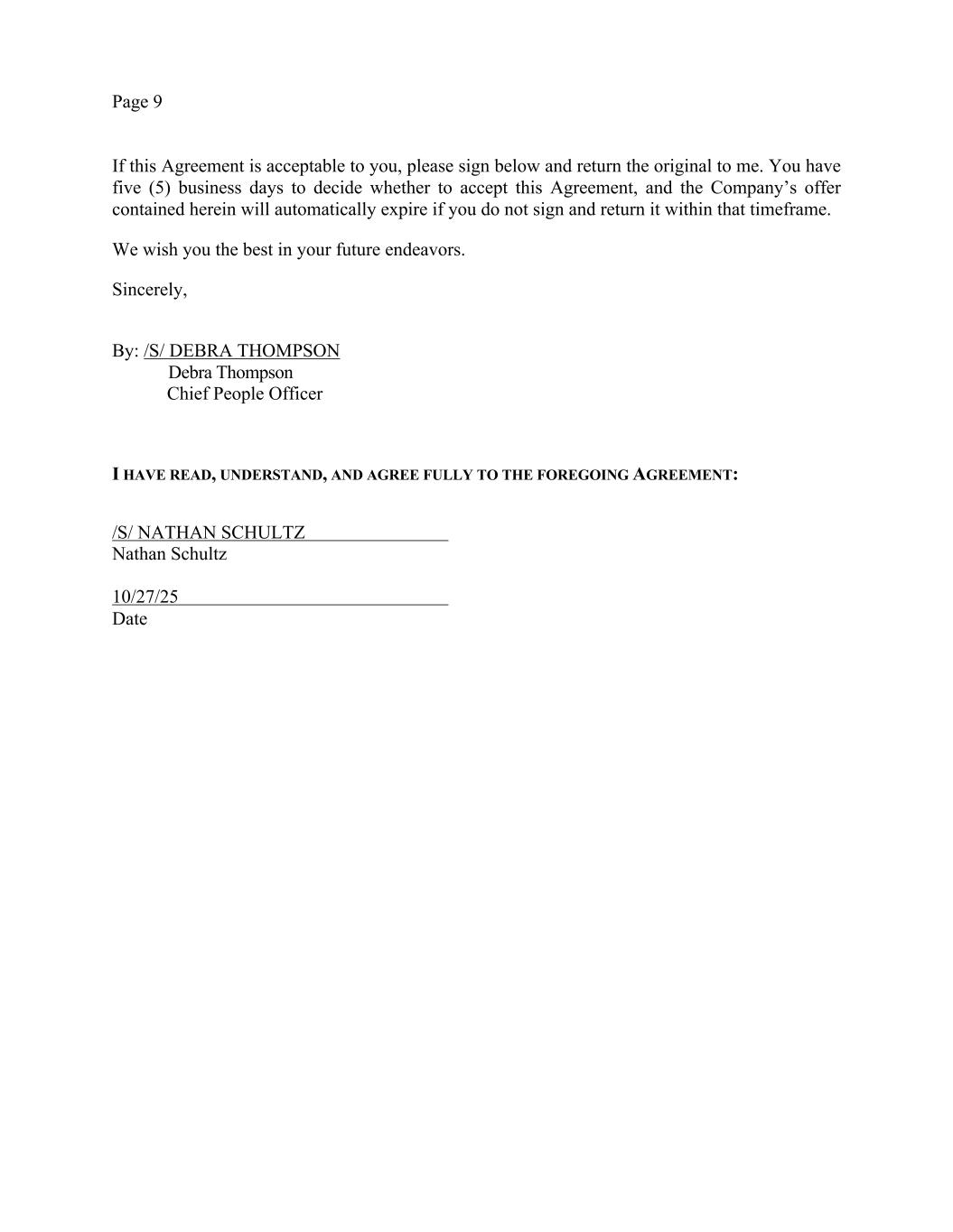 Page 9 If this Agreement is acceptable to you, please sign below and return the original to me. You have five (5) business days to decide whether to accept this Agreement, and the Company’s offer contained herein will automatically expire if you do not sign and return it within that timeframe. We wish you the best in your future endeavors. Sincerely, By: /S/ DEBRA THOMPSON Debra Thompson Chief People Officer I HAVE READ, UNDERSTAND, AND AGREE FULLY TO THE FOREGOING AGREEMENT: /S/ NATHAN SCHULTZ Nathan Schultz 10/27/25 Date