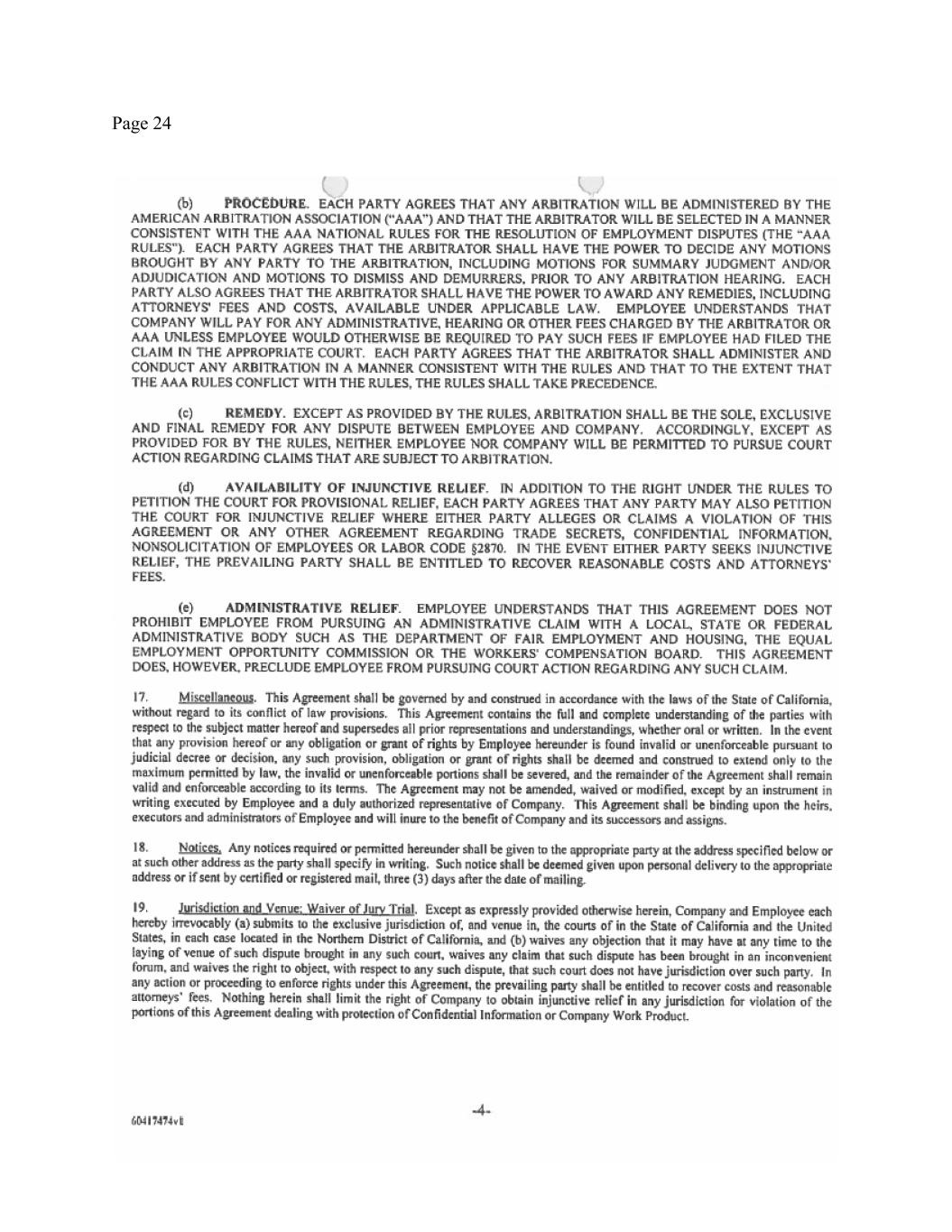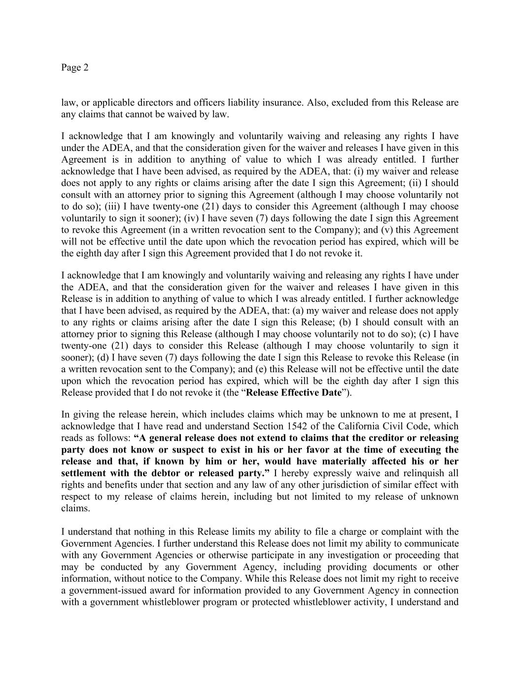 Page 2 law, or applicable directors and officers liability insurance. Also, excluded from this Release are any claims that cannot be waived by law. I acknowledge that I am knowingly and voluntarily waiving and releasing any rights I have under the ADEA, and that the consideration given for the waiver and releases I have given in this Agreement is in addition to anything of value to which I was already entitled. I further acknowledge that I have been advised, as required by the ADEA, that: (i) my waiver and release does not apply to any rights or claims arising after the date I sign this Agreement; (ii) I should consult with an attorney prior to signing this Agreement (although I may choose voluntarily not to do so); (iii) I have twenty-one (21) days to consider this Agreement (although I may choose voluntarily to sign it sooner); (iv) I have seven (7) days following the date I sign this Agreement to revoke this Agreement (in a written revocation sent to the Company); and (v) this Agreement will not be effective until the date upon which the revocation period has expired, which will be the eighth day after I sign this Agreement provided that I do not revoke it. I acknowledge that I am knowingly and voluntarily waiving and releasing any rights I have under the ADEA, and that the consideration given for the waiver and releases I have given in this Release is in addition to anything of value to which I was already entitled. I further acknowledge that I have been advised, as required by the ADEA, that: (a) my waiver and release does not apply to any rights or claims arising after the date I sign this Release; (b) I should consult with an attorney prior to signing this Release (although I may choose voluntarily not to do so); (c) I have twenty-one (21) days to consider this Release (although I may choose voluntarily to sign it sooner); (d) I have seven (7) days following the date I sign this Release to revoke this Release (in a written revocation sent to the Company); and (e) this Release will not be effective until the date upon which the revocation period has expired, which will be the eighth day after I sign this Release provided that I do not revoke it (the “Release Effective Date”). In giving the release herein, which includes claims which may be unknown to me at present, I acknowledge that I have read and understand Section 1542 of the California Civil Code, which reads as follows: “A general release does not extend to claims that the creditor or releasing party does not know or suspect to exist in his or her favor at the time of executing the release and that, if known by him or her, would have materially affected his or her settlement with the debtor or released party.” I hereby expressly waive and relinquish all rights and benefits under that section and any law of any other jurisdiction of similar effect with respect to my release of claims herein, including but not limited to my release of unknown claims. I understand that nothing in this Release limits my ability to file a charge or complaint with the Government Agencies. I further understand this Release does not limit my ability to communicate with any Government Agencies or otherwise participate in any investigation or proceeding that may be conducted by any Government Agency, including providing documents or other information, without notice to the Company. While this Release does not limit my right to receive a government-issued award for information provided to any Government Agency in connection with a government whistleblower program or protected whistleblower activity, I understand and
