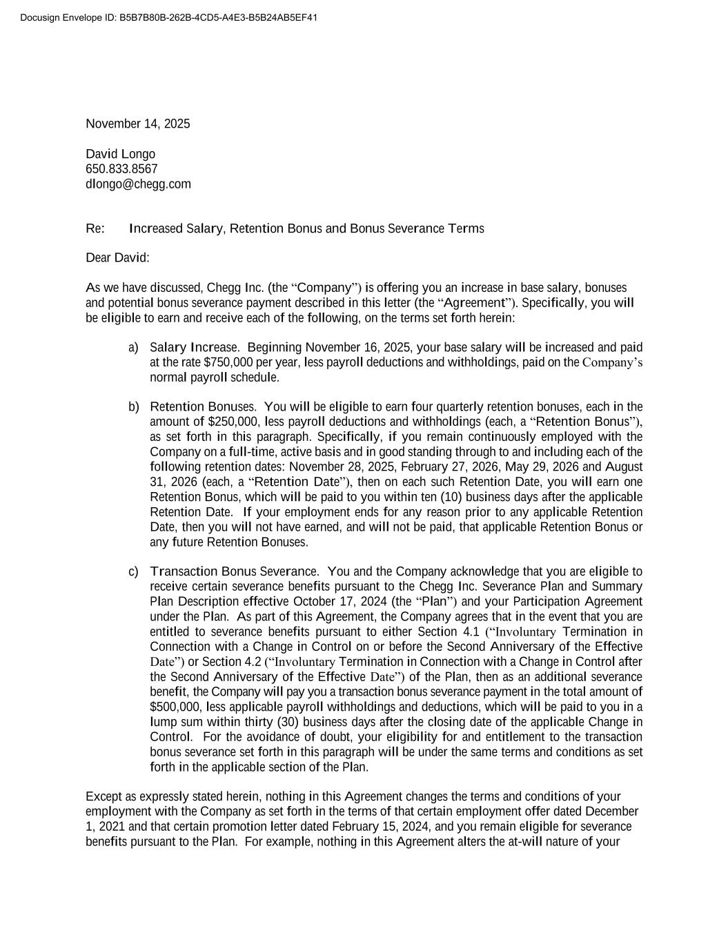 November 14, 2025 David Longo 650.833.8567 dlongo@chegg.com Re: Increased Salary, Retention Bonus and Bonus Severance Terms Dear David: As we have discussed, Chegg Inc. (the “Company”) is offering you an increase in base salary, bonuses and potential bonus severance payment described in this letter (the “Agreement”). Specifically, you will be eligible to earn and receive each of the following, on the terms set forth herein: a) Salary Increase. Beginning November 16, 2025, your base salary will be increased and paid at the rate $750,000 per year, less payroll deductions and withholdings, paid on the Company’s normal payroll schedule. b) Retention Bonuses. You will be eligible to earn four quarterly retention bonuses, each in the amount of $250,000, less payroll deductions and withholdings (each, a “Retention Bonus”), as set forth in this paragraph. Specifically, if you remain continuously employed with the Company on a full-time, active basis and in good standing through to and including each of the following retention dates: November 28, 2025, February 27, 2026, May 29, 2026 and August 31, 2026 (each, a “Retention Date”), then on each such Retention Date, you will earn one Retention Bonus, which will be paid to you within ten (10) business days after the applicable Retention Date. If your employment ends for any reason prior to any applicable Retention Date, then you will not have earned, and will not be paid, that applicable Retention Bonus or any future Retention Bonuses. c) Transaction Bonus Severance. You and the Company acknowledge that you are eligible to receive certain severance benefits pursuant to the Chegg Inc. Severance Plan and Summary Plan Description effective October 17, 2024 (the “Plan”) and your Participation Agreement under the Plan. As part of this Agreement, the Company agrees that in the event that you are entitled to severance benefits pursuant to either Section 4.1 (“Involuntary Termination in Connection with a Change in Control on or before the Second Anniversary of the Effective Date”) or Section 4.2 (“Involuntary Termination in Connection with a Change in Control after the Second Anniversary of the Effective Date”) of the Plan, then as an additional severance benefit, the Company will pay you a transaction bonus severance payment in the total amount of $500,000, less applicable payroll withholdings and deductions, which will be paid to you in a lump sum within thirty (30) business days after the closing date of the applicable Change in Control. For the avoidance of doubt, your eligibility for and entitlement to the transaction bonus severance set forth in this paragraph will be under the same terms and conditions as set forth in the applicable section of the Plan. Except as expressly stated herein, nothing in this Agreement changes the terms and conditions of your employment with the Company as set forth in the terms of that certain employment offer dated December 1, 2021 and that certain promotion letter dated February 15, 2024, and you remain eligible for severance benefits pursuant to the Plan. For example, nothing in this Agreement alters the at-will nature of your Docusign Envelope ID: B5B7B80B-262B-4CD5-A4E3-B5B24AB5EF41