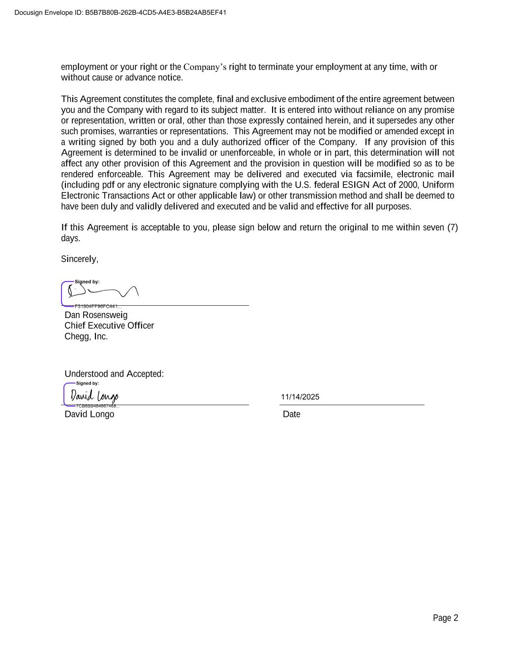 Page 2 employment or your right or the Company’s right to terminate your employment at any time, with or without cause or advance notice. This Agreement constitutes the complete, final and exclusive embodiment of the entire agreement between you and the Company with regard to its subject matter. It is entered into without reliance on any promise or representation, written or oral, other than those expressly contained herein, and it supersedes any other such promises, warranties or representations. This Agreement may not be modified or amended except in a writing signed by both you and a duly authorized officer of the Company. If any provision of this Agreement is determined to be invalid or unenforceable, in whole or in part, this determination will not affect any other provision of this Agreement and the provision in question will be modified so as to be rendered enforceable. This Agreement may be delivered and executed via facsimile, electronic mail (including pdf or any electronic signature complying with the U.S. federal ESIGN Act of 2000, Uniform Electronic Transactions Act or other applicable law) or other transmission method and shall be deemed to have been duly and validly delivered and executed and be valid and effective for all purposes. If this Agreement is acceptable to you, please sign below and return the original to me within seven (7) days. Sincerely, IG_COMPANY_SIGNATURE_1 Dan Rosensweig Chief Executive Officer Chegg, Inc. Understood and Accepted: David Longo Date Docusign Envelope ID: B5B7B80B-262B-4CD5-A4E3-B5B24AB5EF41 11/14/2025