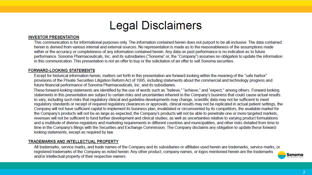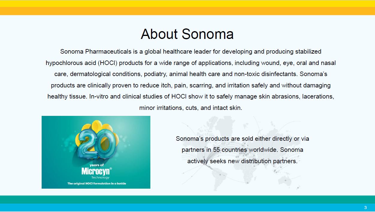Legal Disclaimers INVESTOR PRESENTATION This communication is for informational purposes only. The information contained herein does not purport to be all - inclusive. The data contained herein is derived from various internal and external sources. No representation is made as to the reasonableness of the assumptions made within or the accuracy or completeness of any information contained herein. Any data on past performance is no indication as to future performance. Sonoma Pharmaceuticals, Inc. and its subsidiaries (“Sonoma” or, the “Company”) assumes no obligation to update the information in this communication. This presentation is not an offer to buy or the solicitation of an offer to sell Sonoma securities. FORWARD - LOOKING STATEMENTS Except for historical information herein, matters set forth in this presentation are forward - looking within the meaning of the “safe harbor” provisions of the Private Securities Litigation Reform Act of 1995, including statements about the commercial and technology progress and future financial performance of Sonoma Pharmaceuticals, Inc. and its subsidiaries. These forward - looking statements are identified by the use of words such as “believe,” “achieve,” and “expect,” among others. Forward - looking statements in this presentation are subject to certain risks and uncertainties inherent in the Company’s business that could cause actual results to vary, including such risks that regulatory clinical and guideline developments may change, scientific data may not be sufficient to meet regulatory standards or receipt of required regulatory clearances or approvals, clinical results may not be replicated in actual patient settings, the Company will not have sufficient capital to implement its business plan, invalidated or circumvented by its competitors, the available market for the Company’s products will not be as large as expected, the Company’s products will not be able to penetrate one or more targeted markets, revenues will not be sufficient to fund further development and clinical studies, as well as uncertainties relative to varying product formulations and a multitude of diverse regulatory and marketing requirements in different countries and municipalities, and other risks detailed from time to time in the Company’s filings with the Securities and Exchange Commission. The Company disclaims any obligation to update these forward - looking statements, except as required by law. TRADEMARKS AND INTELLECTUAL PROPERTY All trademarks, service marks, and trade names of the Company and its subsidiaries or affiliates used herein are trademarks, service marks, or registered trademarks of the Company as noted herein. Any other product, company names, or logos mentioned herein are the trademarks and/or intellectual property of their respective owners. 2