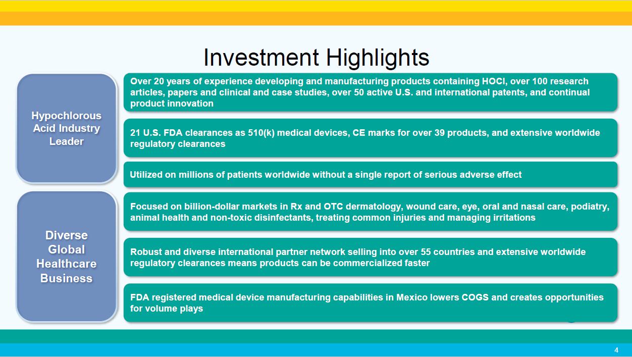 About Sonoma Sonoma Pharmaceuticals is a global healthcare leader for developing and producing stabilized hypochlorous acid (HOCl) products for a wide range of applications, including wound, eye, oral and nasal care, dermatological conditions, podiatry, animal health care and non - toxic disinfectants. Sonoma’s products are clinically proven to reduce itch, pain, scarring, and irritation safely and without damaging healthy tissue. In - vitro and clinical studies of HOCl show it to safely manage skin abrasions, lacerations, minor irritations, cuts, and intact skin. Sonoma’s products are sold either directly or via partners in 55 countries worldwide. Sonoma actively seeks new distribution partners. 3