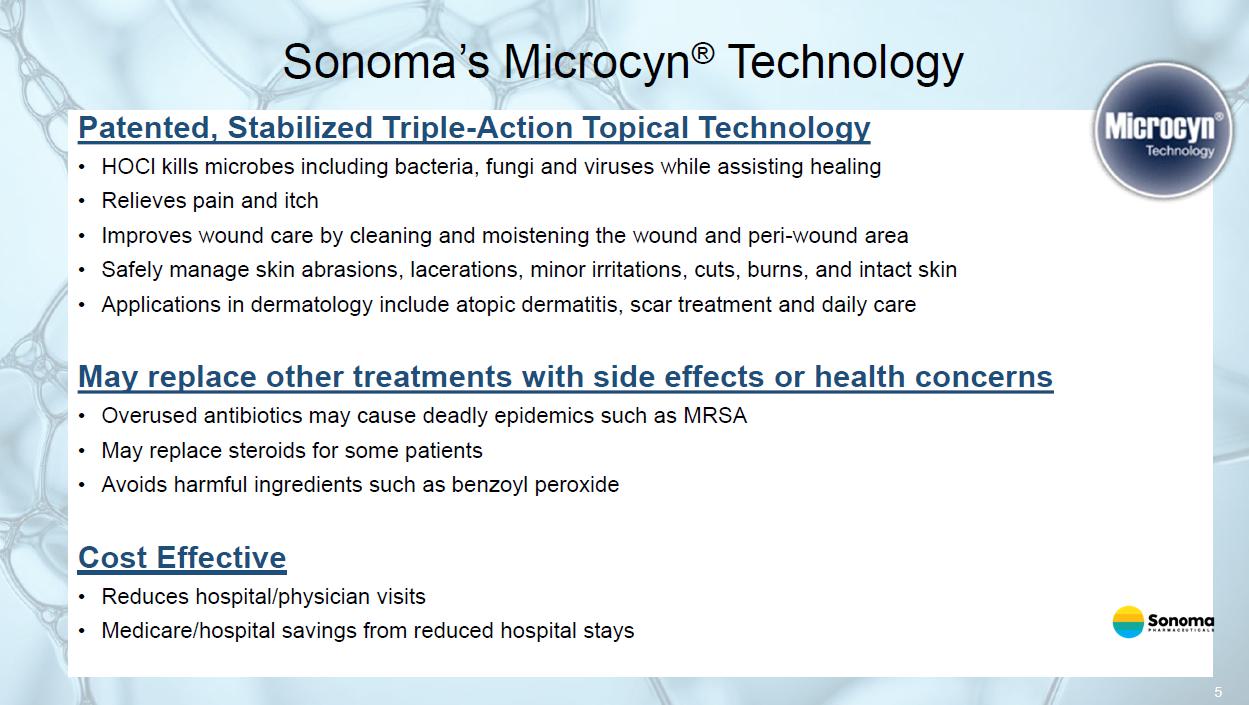 Hypochlorous Acid Industry Leader 21 U.S. FDA clearances as 510(k) medical devices, CE marks for over 39 products, and extensive worldwide regulatory clearances Utilized on millions of patients worldwide without a single report of serious adverse effect Focused on billion - dollar markets in Rx and OTC dermatology, wound care, eye, oral and nasal care, podiatry, animal health and non - toxic disinfectants, treating common injuries and managing irritations Diverse Global Healthcare Business Investment Highlights Over 20 years of experience developing and manufacturing products containing HOCl, over 100 research articles, papers and clinical and case studies, over 50 active U . S . and international patents, and continual product innovation Robust and diverse international partner network selling into over 55 countries and extensive worldwide regulatory clearances means products can be commercialized faster FDA registered medical device manufacturing capabilities in Mexico lowers COGS and creates opportunities for volume plays 4