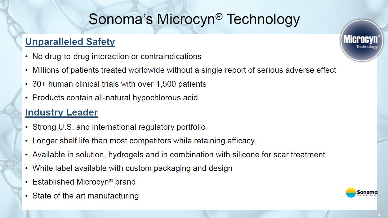 Sonoma’s Microcyn ® Technology Patented, Stabilized Triple - Action Topical Technology • HOCl kills microbes including bacteria, fungi and viruses while assisting healing • Relieves pain and itch • Improves wound care by cleaning and moistening the wound and peri - wound area • Safely manage skin abrasions, lacerations, minor irritations, cuts, burns, and intact skin • Applications in dermatology include atopic dermatitis, scar treatment and daily care May replace other treatments with side effects or health concerns • Overused antibiotics may cause deadly epidemics such as MRSA • May replace steroids for some patients • Avoids harmful ingredients such as benzoyl peroxide Cost Effective • Reduces hospital/physician visits • Medicare/hospital savings from reduced hospital stays 5