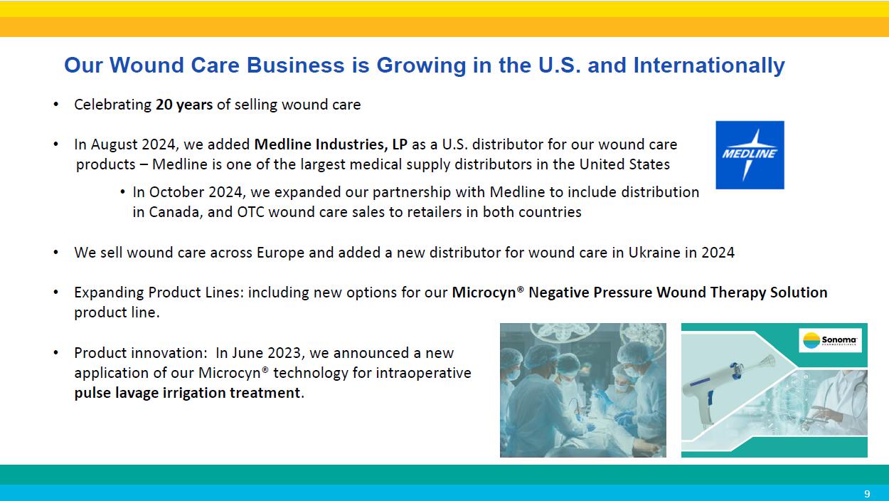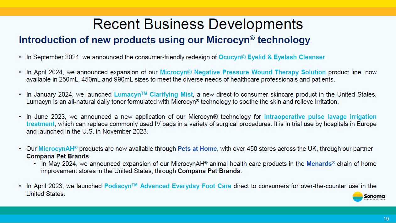 Introduction of new products using our Microcyn ® technology • In September 2024, we announced the consumer - friendly redesign of Ocucyn® Eyelid & Eyelash Cleanser . • In April 2024 , we announced expansion of our Microcyn® Negative Pressure Wound Therapy Solution product line, now available in 250 mL, 450 mL and 990 mL sizes to meet the diverse needs of healthcare professionals and patients . • In January 2024 , we launched Lumacyn TM Clarifying Mist , a new direct - to - consumer skincare product in the United States . Lumacyn is an all - natural daily toner formulated with Microcyn ® technology to soothe the skin and relieve irritation . • In June 2023 , we announced a new application of our Microcyn® technology for intraoperative pulse lavage irrigation treatment , which can replace commonly used IV bags in a variety of surgical procedures . It is in trial use by hospitals in Europe and launched in the U . S . in November 2023 . • Our MicrocynAH ® products are now available through Pets at Home , with over 450 stores across the UK, through our partner Compana Pet Brands • In May 2024, we announced expansion of our MicrocynAH ® animal health care products in the Menards ® chain of home improvement stores in the United States, through Compana Pet Brands . • In April 2023, we launched Podiacyn TM Advanced Everyday Foot Care direct to consumers for over - the - counter use in the United States . Recent Business Developments 19