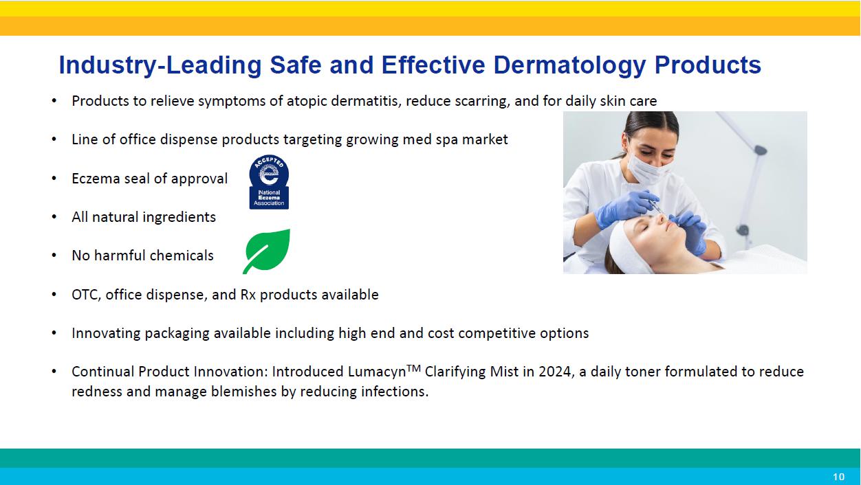 Our Wound Care Business is Growing in the U.S. and Internationally • Celebrating 20 years of selling wound care • In August 2024, we added Medline Industries, LP as a U.S. distributor for our wound care products – Medline is one of the largest medical supply distributors in the United States • In October 2024, we expanded our partnership with Medline to include distribution in Canada, and OTC wound care sales to retailers in both countries • We sell wound care across Europe and added a new distributor for wound care in Ukraine in 2024 • Expanding Product Lines: including new options for our Microcyn® Negative Pressure Wound Therapy Solution product line. • Product innovation: In June 2023, we announced a new application of our Microcyn® technology for intraoperative pulse lavage irrigation treatment . 9