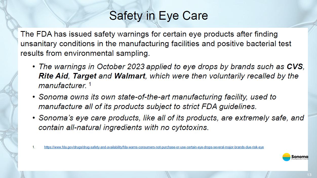 Safety in Eye Care The FDA has issued safety warnings for certain eye products after finding unsanitary conditions in the manufacturing facilities and positive bacterial test results from environmental sampling. • The warnings in October 2023 applied to eye drops by brands such as CVS , Rite Aid , Target and Walmart , which were then voluntarily recalled by the manufacturer. 1 • Sonoma owns its own state - of - the - art manufacturing facility, used to manufacture all of its products subject to strict FDA guidelines. • Sonoma’s eye care products, like all of its products, are extremely safe, and contain all - natural ingredients with no cytotoxins. 1. https://www.fda.gov/drugs/drug - safety - and - availability/fda - warns - consumers - not - purchase - or - use - certain - eye - drops - several - major - brands - due - risk - eye 13