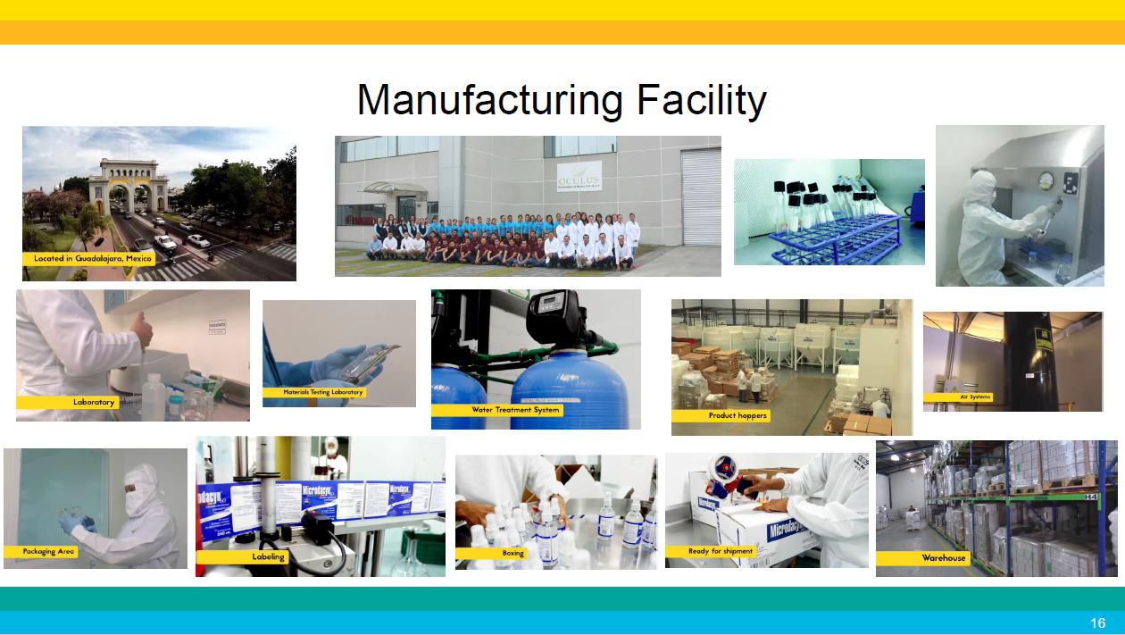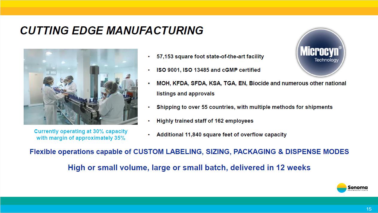 • 57,153 square foot state - of - the - art facility • ISO 9001, ISO 13485 and cGMP certified • MOH, KFDA, SFDA, KSA, TGA, EN, Biocide and numerous other national listings and approvals • Shipping to over 55 countries, with multiple methods for shipments • Highly trained staff of 162 employees • Additional 11,840 square feet of overflow capacity CUTTING EDGE MANUFACTURING Flexible operations capable of CUSTOM LABELING, SIZING, PACKAGING & DISPENSE MODES High or small volume, large or small batch, delivered in 12 weeks Currently operating at 30% capacity with margin of approximately 35% 15