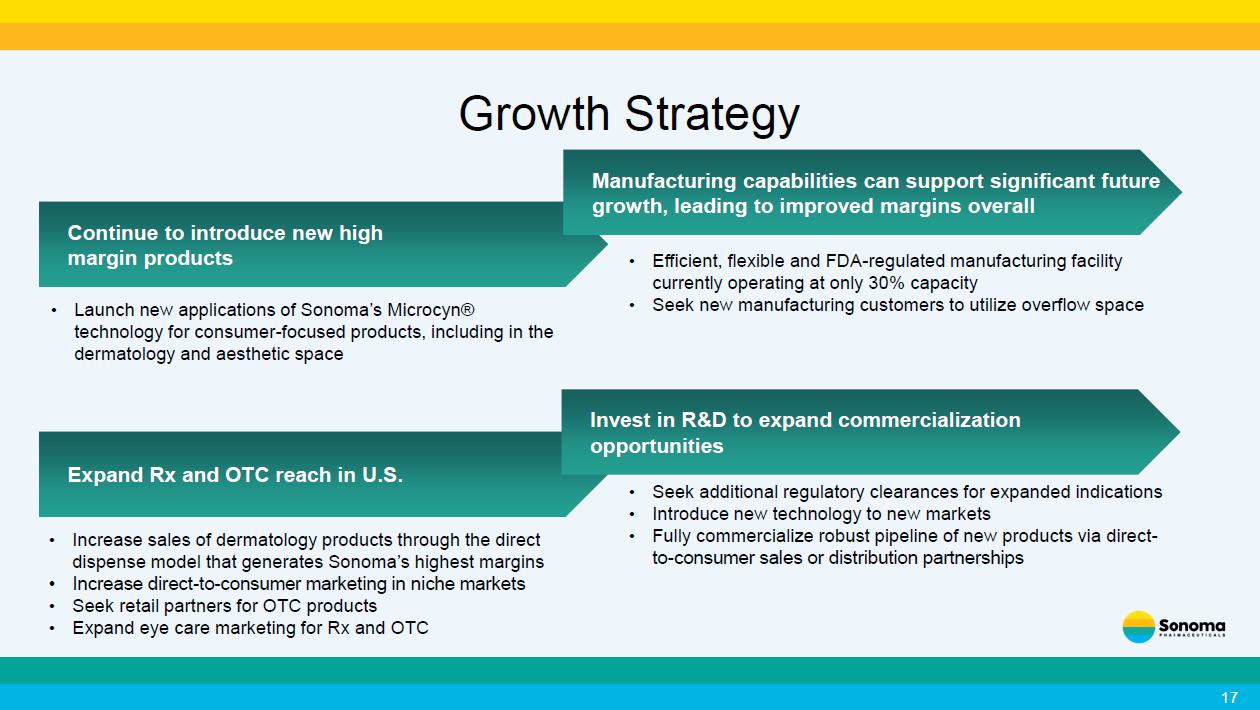 Continue to introduce new high margin products Manufacturing capabilities can support significant future growth, leading to improved margins overall • Launch new applications of Sonoma’s Microcyn® technology for consumer - focused products, including in the dermatology and aesthetic space Growth Strategy • Efficient, flexible and FDA - regulated manufacturing facility currently operating at only 30% capacity • Seek new manufacturing customers to utilize overflow space Expand Rx and OTC reach in U.S. 17 • Increase sales of dermatology products through the direct dispense model that generates Sonoma’s highest margins • Increase direct - to - consumer marketing in niche markets • Seek retail partners for OTC products • Expand eye care marketing for Rx and OTC Invest in R&D to expand commercialization opportunities • Seek additional regulatory clearances for expanded indications • Introduce new technology to new markets • Fully commercialize robust pipeline of new products via direct - to - consumer sales or distribution partnerships