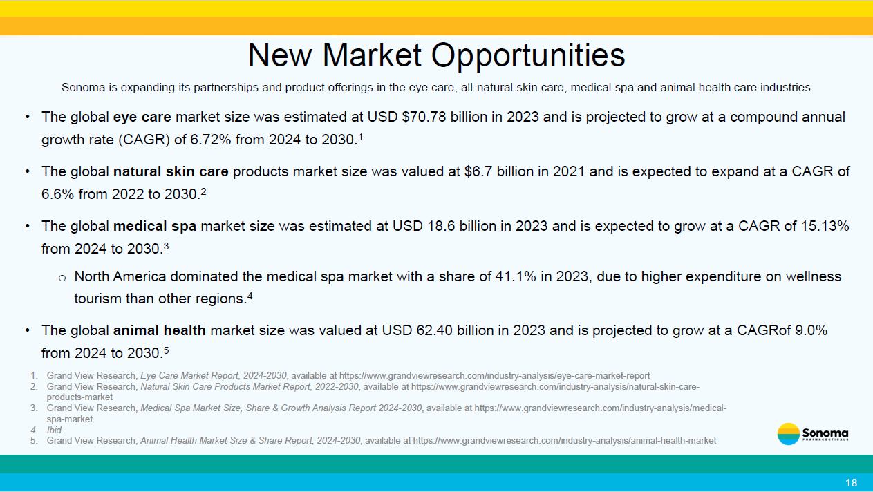 New Market Opportunities Sonoma is expanding its partnerships and product offerings in the eye care, all - natural skin care, medical spa and animal health care industries. • The global eye care market size was estimated at USD $70.78 billion in 2023 and is projected to grow at a compound annual growth rate (CAGR) of 6.72% from 2024 to 2030. 1 • The global natural skin care products market size was valued at $6.7 billion in 2021 and is expected to expand at a CAGR of 6.6% from 2022 to 2030. 2 • The global medical spa market size was estimated at USD 18.6 billion in 2023 and is expected to grow at a CAGR of 15.13% from 2024 to 2030. 3 o North America dominated the medical spa market with a share of 41.1% in 2023, due to higher expenditure on wellness tourism than other regions. 4 • The global animal health market size was valued at USD 62.40 billion in 2023 and is projected to grow at a CAGRof 9.0% from 2024 to 2030. 5 1. Grand View Research, Eye Care Market Report, 2024 - 2030 , available at https ://www.grandviewresearch.com/industry - analysis/eye - care - market - report 2. Grand View Research, Natural Skin Care Products Market Report, 2022 - 2030 , available at https ://www.grandviewresearch.com/industry - analysis/natural - skin - care - products - market 3. Grand View Research, Medical Spa Market Size, Share & Growth Analysis Report 2024 - 2030 , available at https ://www.grandviewresearch.com/industry - analysis/medical - spa - market 4. Ibid. 5. Grand View Research, Animal Health Market Size & Share Report, 2024 - 2030 , available at https ://www.grandviewresearch.com/industry - analysis/animal - health - market 18