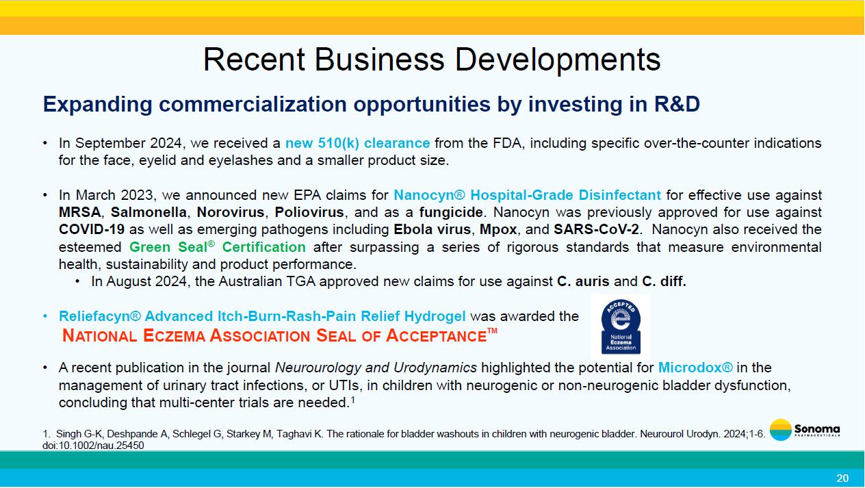 Expanding commercialization opportunities by investing in R&D • In September 2024, we received a new 510(k) clearance from the FDA, including specific over - the - counter indications for the face, eyelid and eyelashes and a smaller product size. • In March 2023 , we announced new EPA claims for Nanocyn® Hospital - Grade Disinfectant for effective use against MRSA , Salmonella , Norovirus , Poliovirus , and as a fungicide . Nanocyn was previously approved for use against COVID - 19 as well as emerging pathogens including Ebola virus , Mpox , and SARS - CoV - 2 . Nanocyn also received the esteemed Green Seal ® Certification after surpassing a series of rigorous standards that measure environmental health, sustainability and product performance . • In August 2024 , the Australian TGA approved new claims for use against C . auris and C . diff . • Reliefacyn® Advanced Itch - Burn - Rash - Pain Relief Hydrogel was awarded the N ATIONAL E CZEMA A SSOCIATION S EAL OF A CCEPTANCE TM • A recent publication in the journal Neurourology and Urodynamics highlighted the potential for Microdox® in the management of urinary tract infections, or UTIs, in children with neurogenic or non - neurogenic bladder dysfunction, concluding that multi - center trials are needed. 1 1. Singh G - K, Deshpande A, Schlegel G, Starkey M, Taghavi K. The rationale for bladder washouts in children with neurogenic bladder. Neurourol Urodyn. 2024;1 - 6. doi:10.1002/nau.25450 Recent Business Developments 20