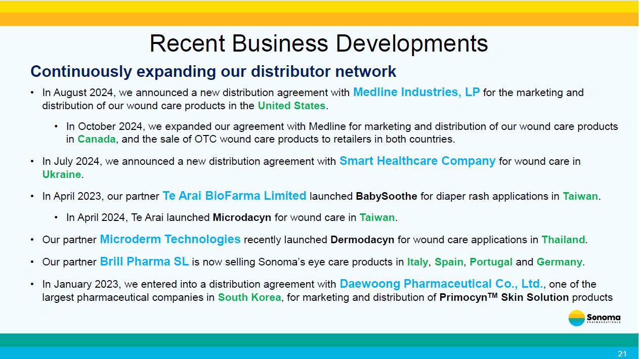 Continuously expanding our distributor network • In August 2024, we announced a new distribution agreement with Medline Industries, LP for the marketing and distribution of our wound care products in the United States . • In October 2024, we expanded our agreement with Medline for marketing and distribution of our wound care products in Canada , and the sale of OTC wound care products to retailers in both countries. • In July 2024, we announced a new distribution agreement with Smart Healthcare Company for wound care in Ukraine . • In April 2023, our partner Te Arai BioFarma Limited launched BabySoothe for diaper rash applications in Taiwan . • In April 2024, Te Arai launched Microdacyn for wound care in Taiwan . • Our partner Microderm Technologies recently launched Dermodacyn for wound care applications in Thailand . • Our partner Brill Pharma SL is now selling Sonoma’s eye care products in Italy , Spain , Portugal and Germany . • In January 2023, we entered into a distribution agreement with Daewoong Pharmaceutical Co., Ltd. , one of the largest pharmaceutical companies in South Korea , for marketing and distribution of Primocyn TM Skin Solution products Recent Business Developments 21