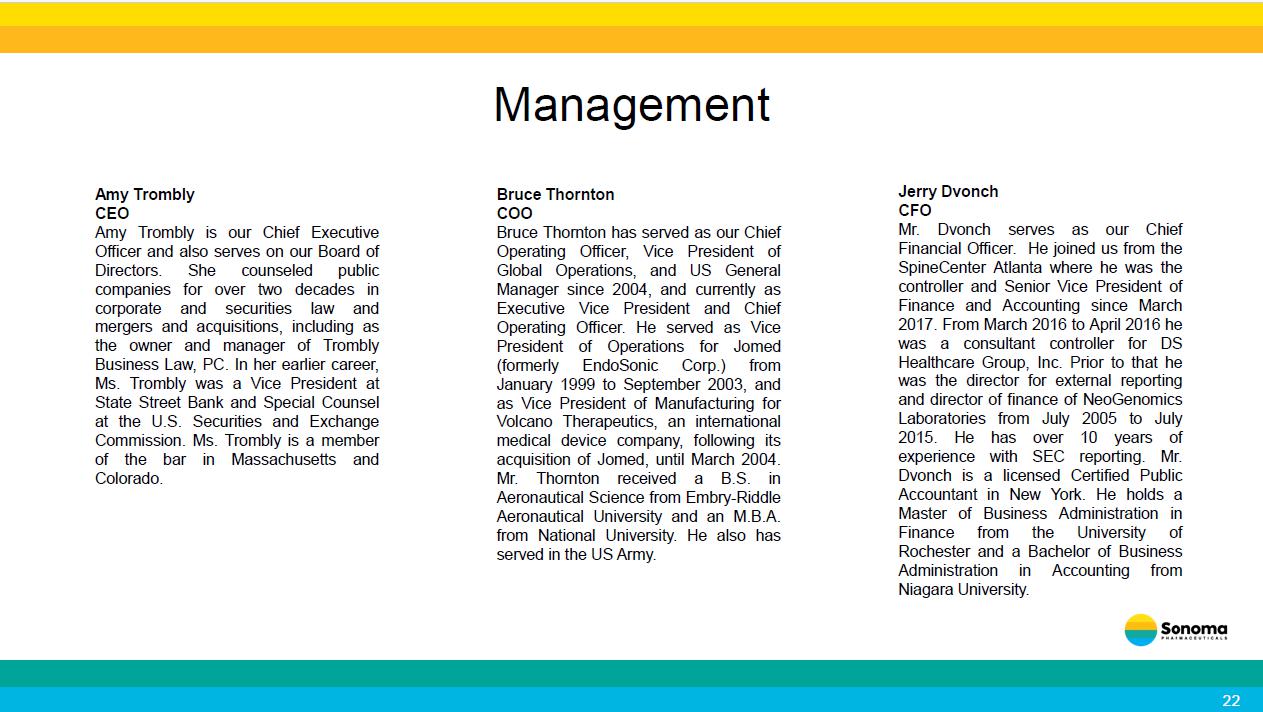 Management Amy Trombly CEO Amy Trombly 22 is our Chief Executive Officer and also serves on our Board of She counseled public for over two decades in Directors. companies corporate and securities law and mergers and acquisitions, including as the owner and manager of Trombly Business Law, PC . In her earlier career, Ms . Trombly was a Vice President at State Street Bank and Special Counsel at the U . S . Securities and Exchange Commission . Ms . Trombly is a member of the bar in Massachusetts and Colorado . Bruce Thornton COO Bruce Thornton has served as our Chief Operating Officer, Vice President of Global Operations, and US General Manager since 2004 , and currently as Vice President and Chief Officer . He served as Vice of Operations for Jomed Executive Operating President (formerly EndoSonic Corp.) from January 1999 to September 2003, and as Vice President of Manufacturing for Volcano Therapeutics, an international medical device company, following its acquisition of Jomed, until March 2004 . Mr . Thornton received a B . S . in Aeronautical Science from Embry - Riddle Aeronautical University and an M . B . A . from National University . He also has served in the US Army . Jerry Dvonch CFO Mr. Dvonch serves as our Chief Financial Officer . He joined us from the SpineCenter Atlanta where he was the controller and Senior Vice President of Finance and Accounting since March 2017 . From March 2016 to April 2016 he was a consultant controller for DS Healthcare Group, Inc . Prior to that he was the director for external reporting and director of finance of NeoGenomics Laboratories from July 2005 to July 2015. He has over 10 years of with SEC reporting. Mr. experience Dvonch is a licensed Certified Public Accountant in New York. He holds a Master of Business Administration in Finance from the University of Rochester and a Bachelor of Business Administration in Accounting from Niagara University .