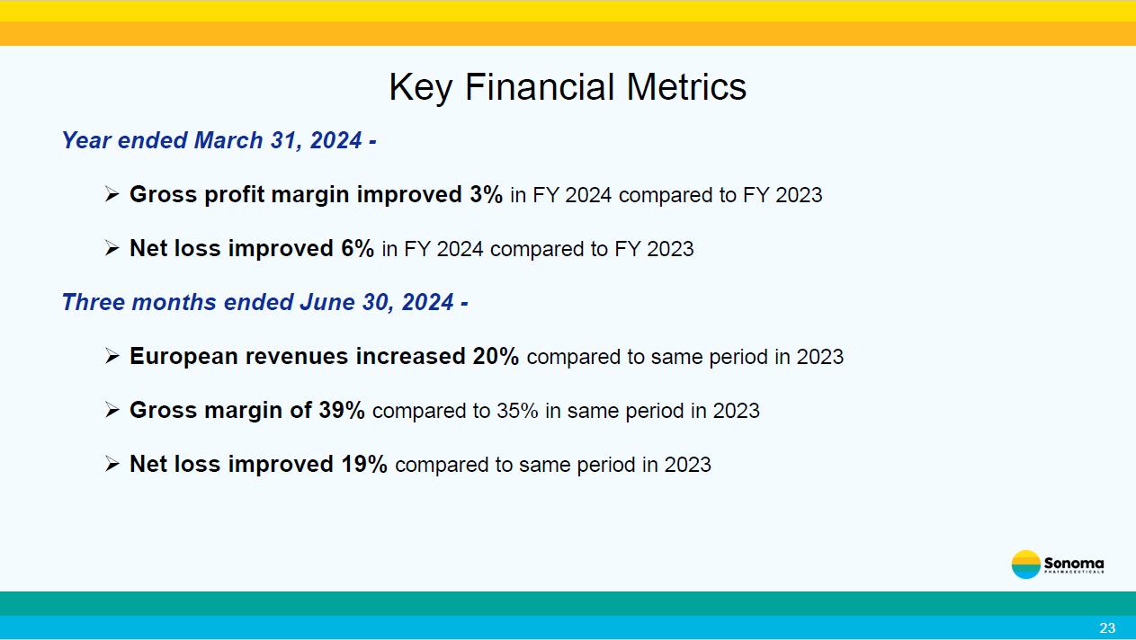 Key Financial Metrics 23 Year ended March 31, 2024 - » Gross profit margin improved 3% in FY 2024 compared to FY 2023 » Net loss improved 6% in FY 2024 compared to FY 2023 Three months ended June 30, 2024 - » European revenues increased 20% compared to same period in 2023 » Gross margin of 39% compared to 35% in same period in 2023 » Net loss improved 19% compared to same period in 2023