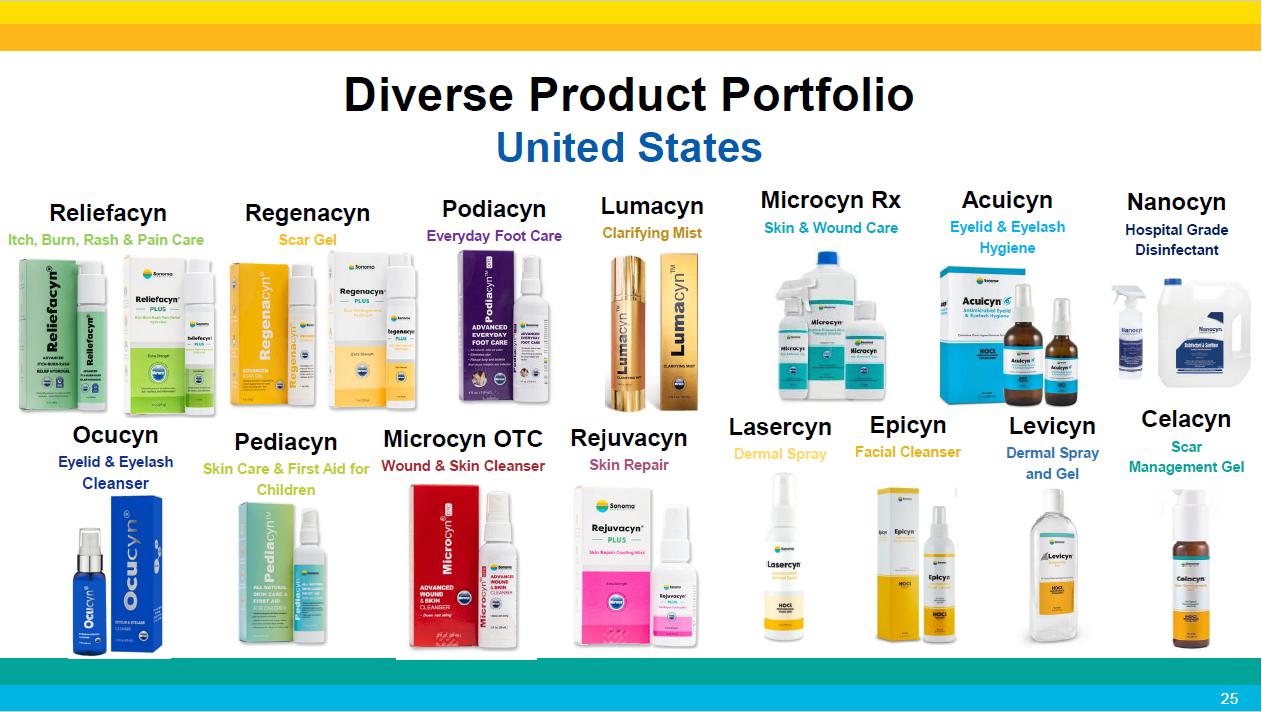 Diverse Product Portfolio United States Lumacyn Clarifying Mist Microcyn Rx Skin & Wound Care Regenacyn Scar Gel Epicyn Facial Cleanser Nanocyn Hospital Grade Disinfectant Levicyn Dermal Spray and Gel Celacyn Scar Management Gel Rejuvacyn Skin Repair Reliefacyn Itch, Burn, Rash & Pain Care Microcyn OTC Wound & Skin Cleanser Ocucyn Eyelid & Eyelash Cleanser Pediacyn Skin Care & First Aid for Children Acuicyn Eyelid & Eyelash Hygiene Podiacyn Everyday Foot Care Lasercyn Dermal Spray 25